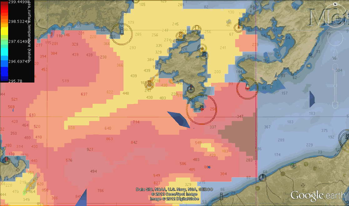 De telles données sont disponibles gratuitement sur de nombreux sites, e.g., http://www.myocean.eu/ (merci de poster ici les adresses de sites qui pourraient s’avérer intéressants pour d’autres régions). En accédant au catalogue, on choisit une zone, un paramètre (température) et observations (le type de produit). Au mieux, les données de TSM sont proposées avec un pixel de 1 km sur une base journalière mais, essentiellement pour compenser les pertes d’information liées à la couverture nuageuse, des compositions dans le temps et l’espace sont toujours proposées. Pour la Méditerranée en particulier, 5 produits sont offerts dont le 5ème fournit les données les plus intéressantes ( 1 km, jour) avec “info”. Puis, après avoir choisi la date et la sous-zone, il faut ajuster l’échelle des couleurs à l’échelle des températures de cette sous-zone (le bouton rond), ouvrir l’image dans Google Earth et laisser celui-ci ouvert.