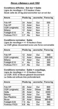 | Résumé Sailing Today Décembre 2003 Ce test a été réalisé par une revue anglaise sur un fond de vase sableuse et gravier (gritty mud !), ce qui bouscule pas mal l’ordre convenu des résultats ! l’article en PdF ici : http://www.sextan.com/article.php3?... , la revue ici : http://www.sailingtoday.co.uk http://www.sailingtoday.co.uk/st/co... |