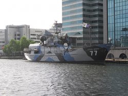 Le camouflage disruptif peut également être rencontré dans le civil, à des fins artistiques. Des navires privés ont été peints en camouflage disruptif dans un but purement esthétique. Notamment les navires de la Sea Shepherd Conservation Society (SSCS) le Steve Irwin et le Bob Barker en bleu, gris et noir ainsi que le Sam Simon en blanc, gris et noir, navire utilisé dans le combat contre la chasse à la baleine, repeint en camouflage disruptif en 2011. Sur la photo de droite, Sam Simon, tournant le dos à la fontaine d’Arethuse, celle de Syracuse “voir note” [9]