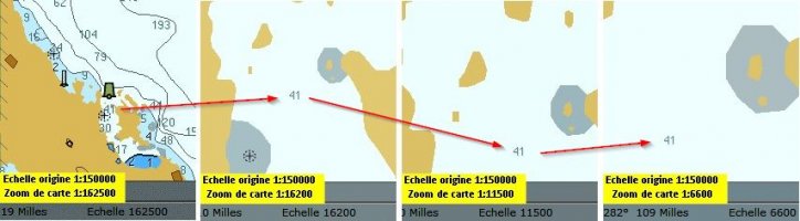 - Pour les C-map, c’est très clair, la carte est juste au 1:150000, après ce ne sont que des grossissements, de la même carte. Au final et au 1:6600, ça en devient grotesque