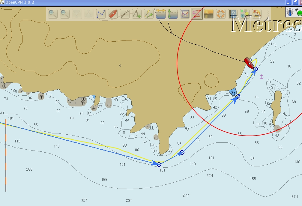 J’utilise de façon intensive l’option ‘’route’’, pour mes navigations. C’est systématique. Et j’active tout aussi obligatoirement l’option trace… Que je recadre avec la route. “Je ne regarde jamais mon compas de route…”De ce point de vue, et en s’en servant comme je l’ai indiqué plus haut, OpenCPN est tout à fait fiable et fonctionnel… en fait comme pour Maxsea… Il faut prendre ce qui convient dans ce qui est proposé. De ce point de vue (en particulier dans la gestion des couches), OpenCPN est infiniment plus pratique que Maxsea…