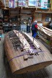 Après avoir procédé à cet état des lieux, nous avons longuement discuté avant de finaliser la démarche de la restauration. Contrairement à notre premier avis nous avons finalement décidé de déposer le pont. Cela est rendu nécessaire par l’obligation de remplacer de très nombreux barrots, ce qui est impossible avec le pont en place. Même pour un petit gabarit, il est impossible de se glisser sous la pointe avant pour y travailler. Nous avons également décidé de restaurer les espars en bambou. En travaillant minutieusement, il est possible de recoller les fissures et de redonner au bambou sa section d’origine. Une partie des bordés du fond doit, à l’évidence, être changée et bien entendu les bordés manquants remplacés.