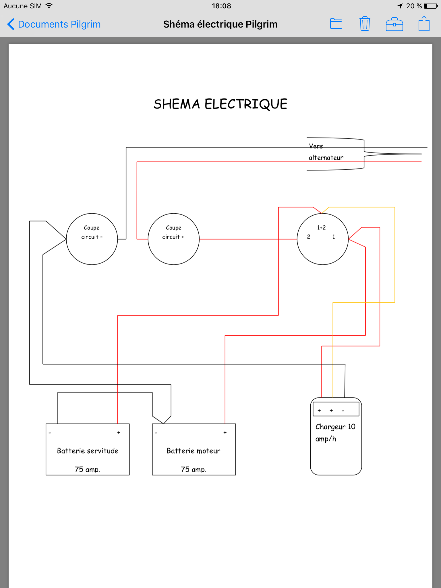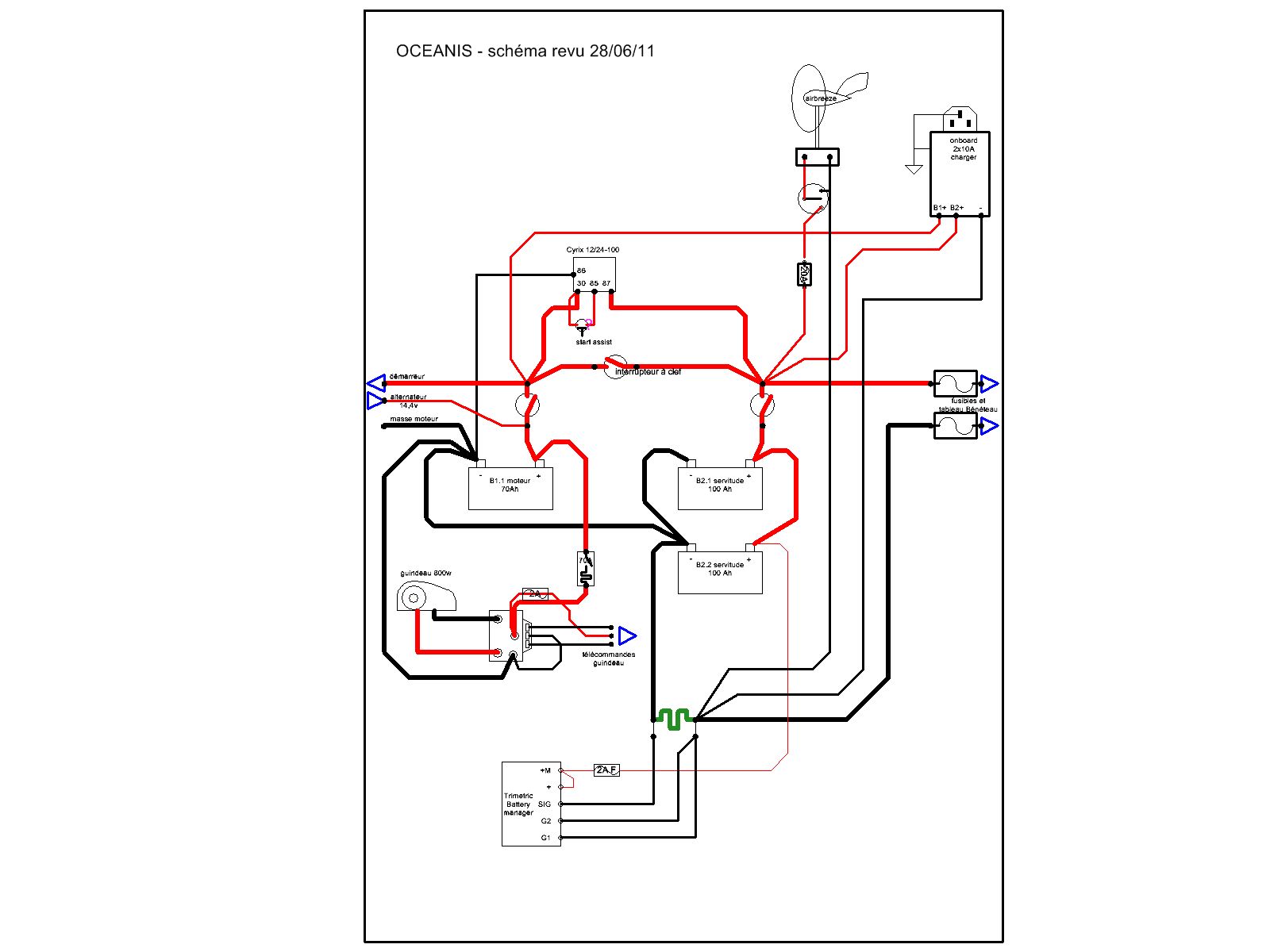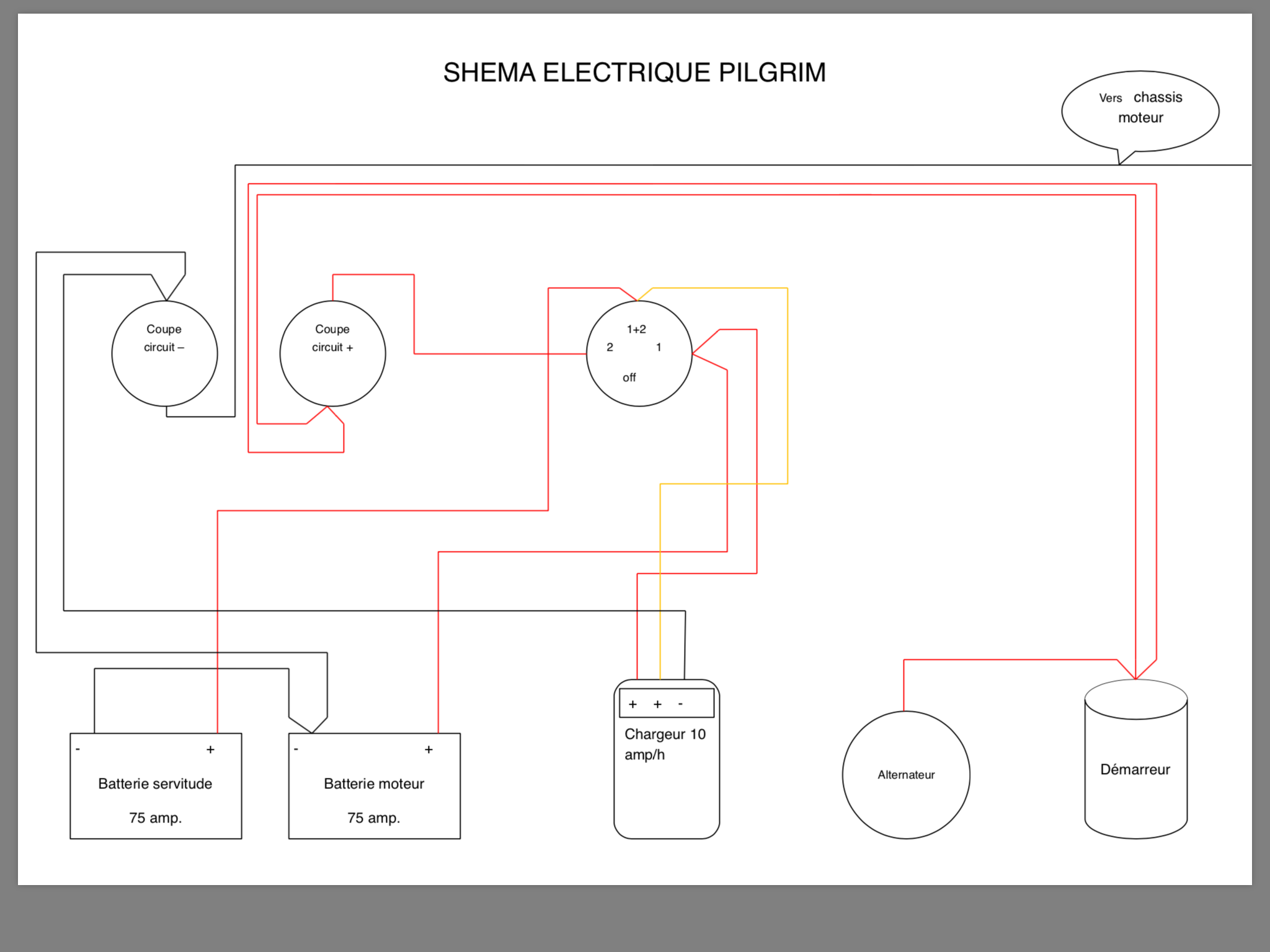 je joins le shéma que j’ai réalisé en essayant de remonter chaque câble mais ce n’est pas toujours facile et j’ai pu faire des erreurs. Si vous trouvez des incohérences voire des impossibilités, faites m’en part, j’irai vérifier sur le bateau.