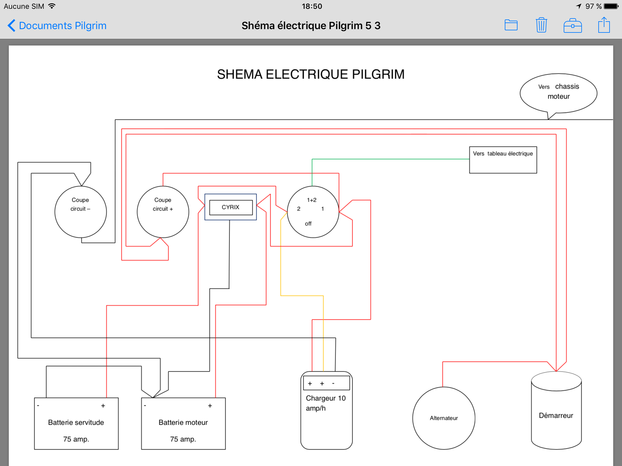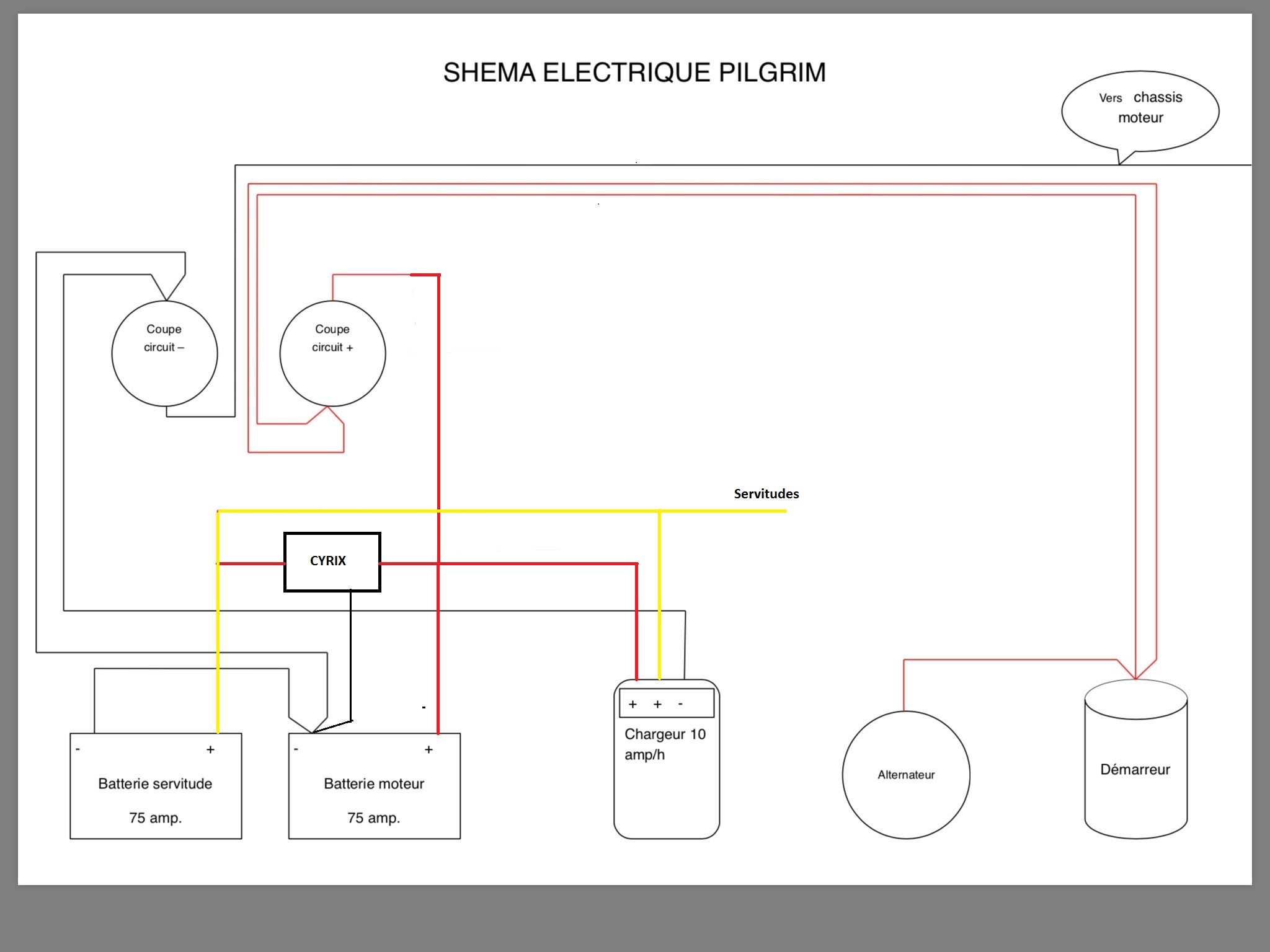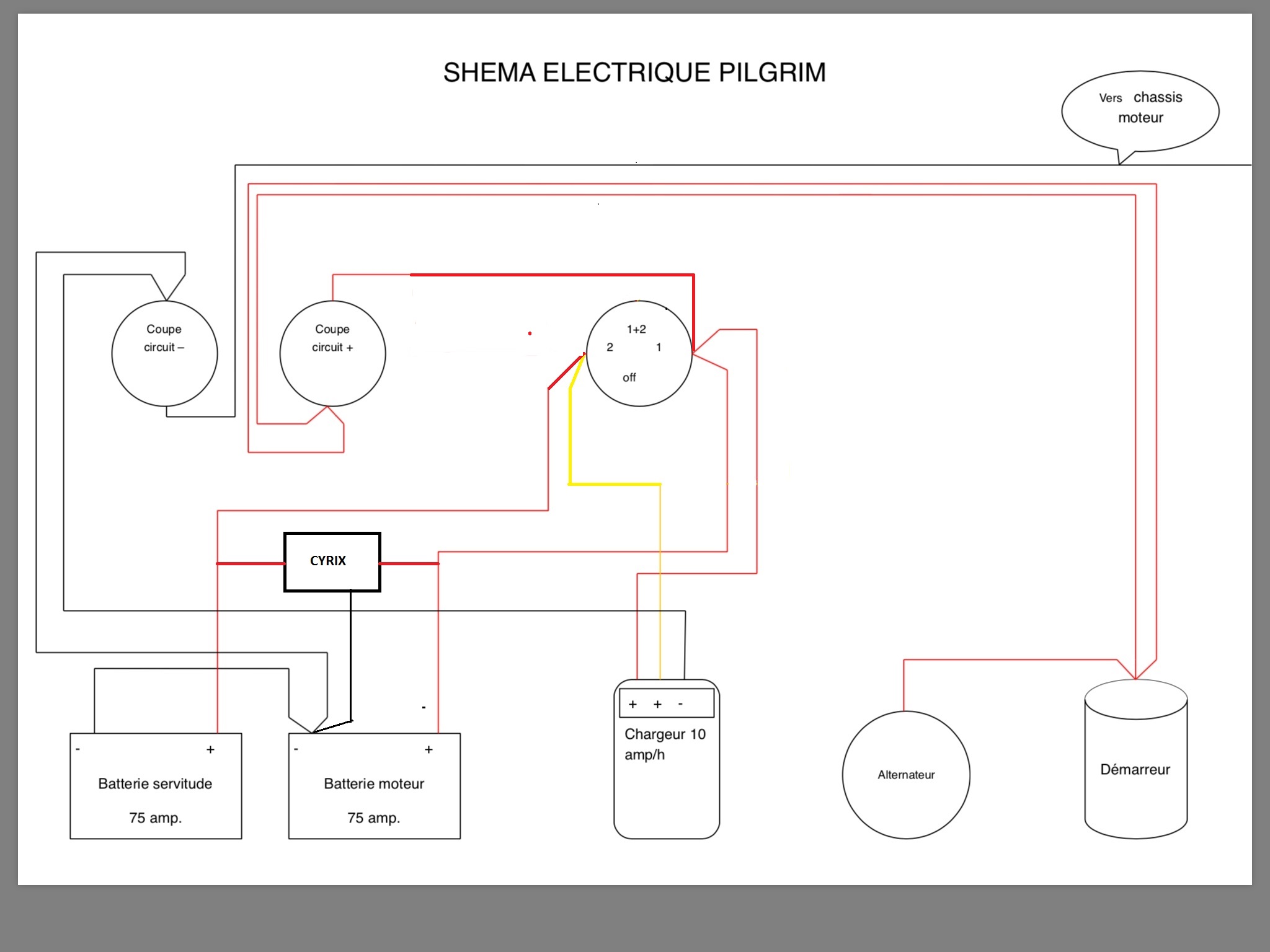 je joins le shéma que j’ai réalisé en essayant de remonter chaque câble mais ce n’est pas toujours facile et j’ai pu faire des erreurs. Si vous trouvez des incohérences voire des impossibilités, faites m’en part, j’irai vérifier sur le bateau.