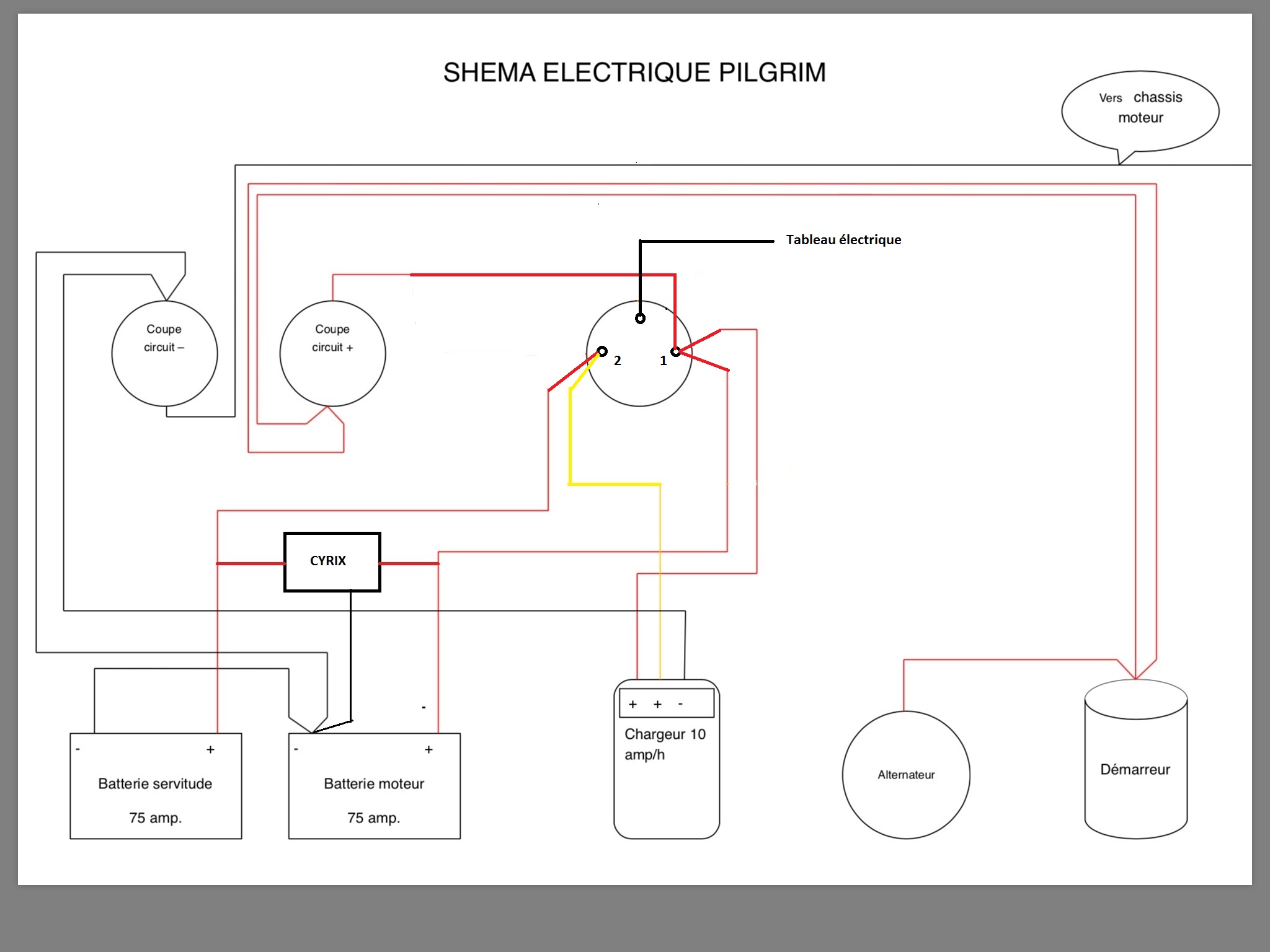 Ne pas tenir compte de mon message précédent. En fait les 2 fils dont je fais mention dans mon message du 10/01 qui sont connectés au + du coupe circuit vont vers le tableau électrique. Étant donné que le coupe circuit + se trouve en amant du coupleur, il est normal que les appareils de bord fonctionnent même avec le coupleur de batterie sur off. Je pense que ce branchement est lié au fait que le bateau n’était équipé qu’avec une batterie à l’origine. Je vais brancher ces 2 fils reliés entre eux au commun du coupleur comme vous le,préconisez.