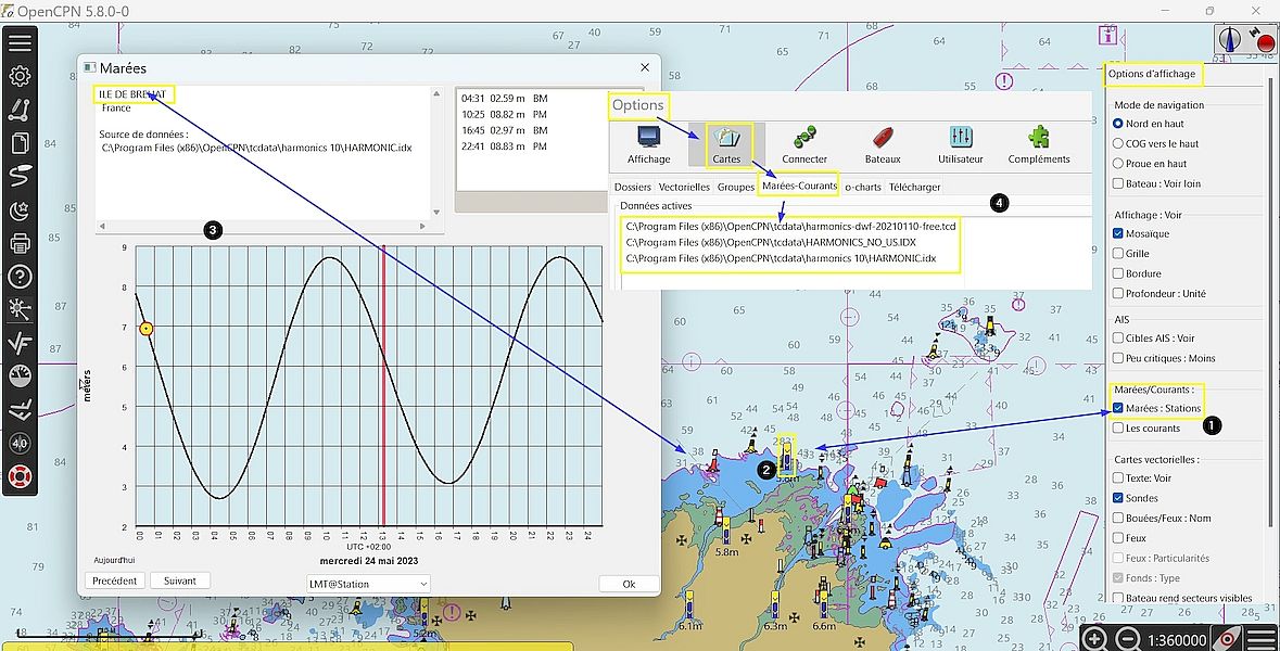 - Une troisième concernant la procédure de mise à jours des paramètres des marées et courants (4 sur l’image)