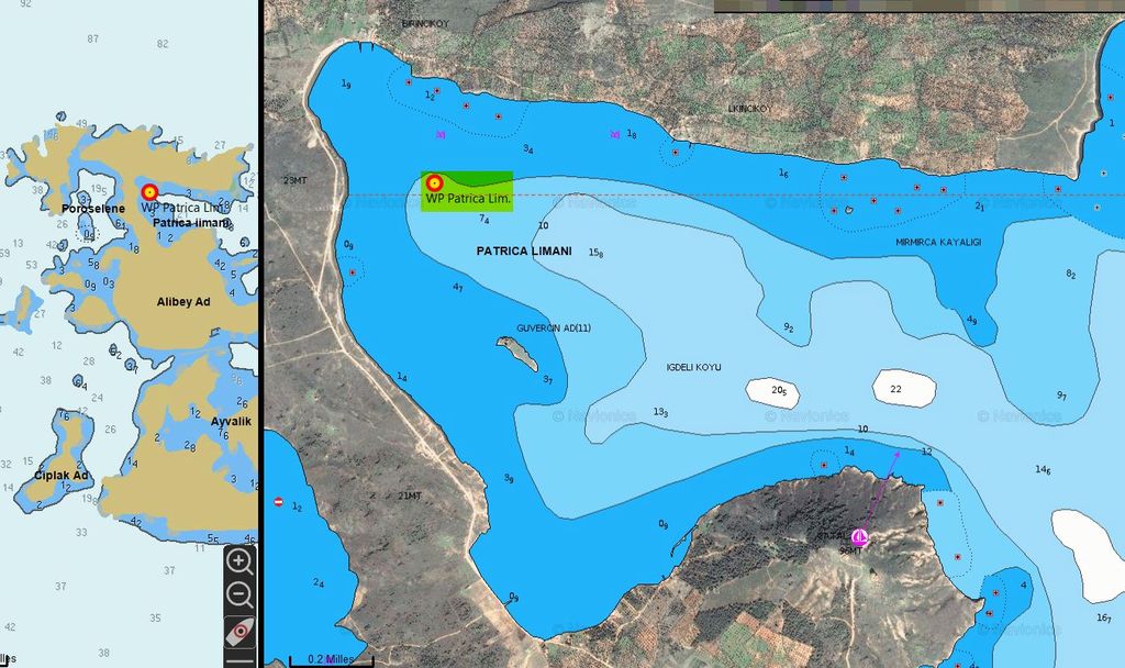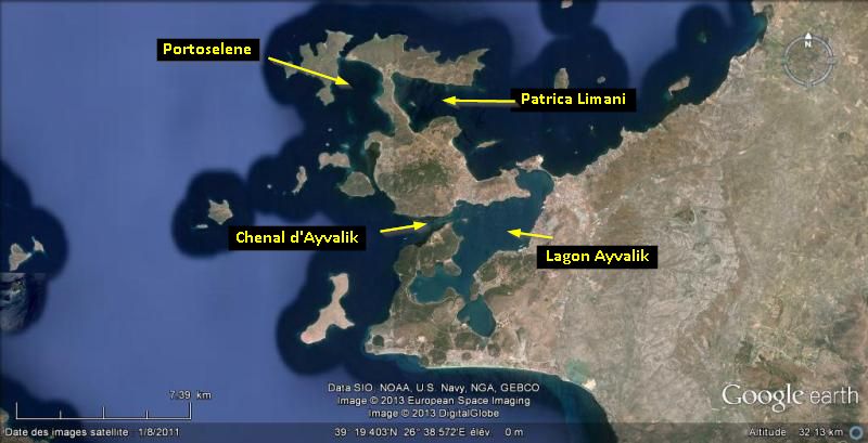 - Patrica Limani, à l’Est de l’isthme d’Alibey, complètement extérieur au lagon, il faudra contourner l’archipel et pénétrer dans le détroit d’Edremit. Soumis à l’influence du meltem, il faudra soigner son mouillage