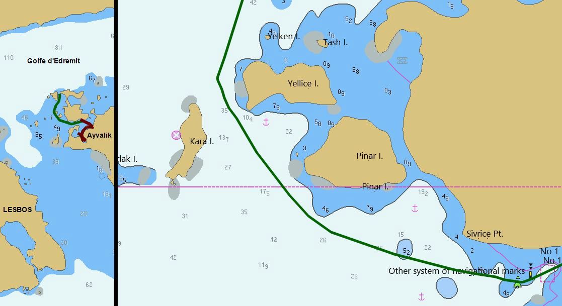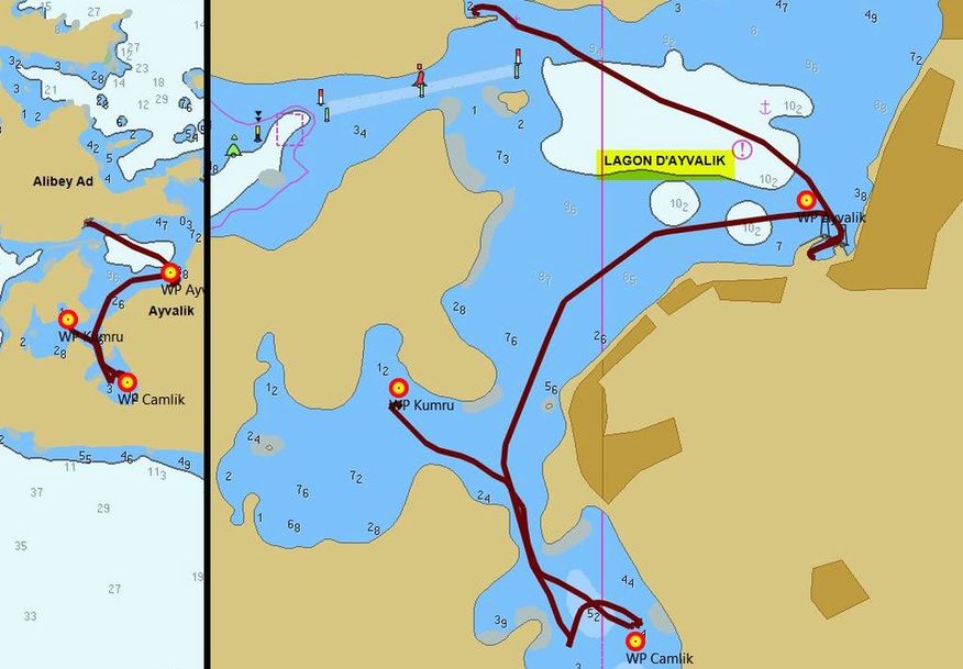 - Le lagon d’Ayvalik est commandé par un chenal balisé de 3 paires de marques latérales, à respecter scrupuleusement
