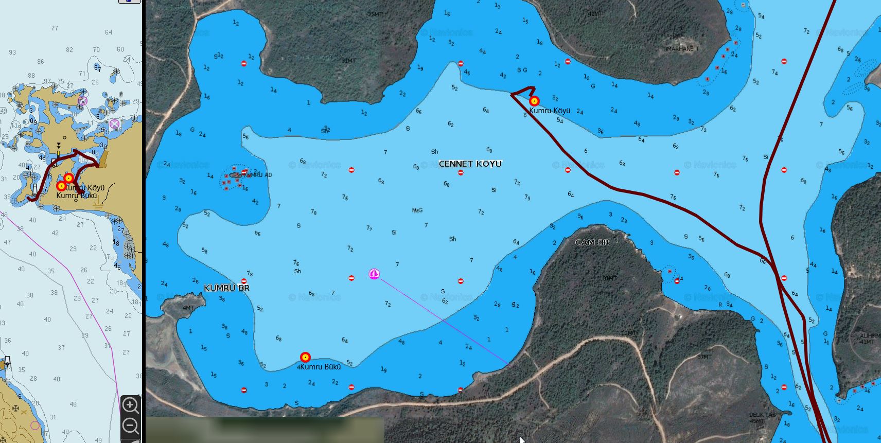 - Au sud Ouest du lagon, la baie de Kumru Koyu, peu protégée des vents dominants, sauf dans son NE,à la limite des sondes de 2m, dans une ambiance sévère et solitaire
