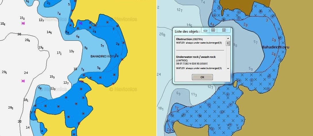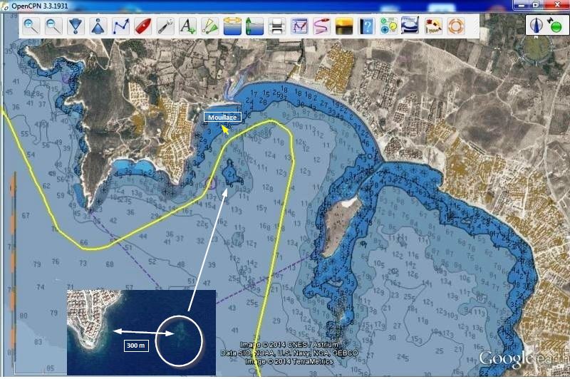 - Le centre de la baie est encombré d’un haut fond mal cartographié. Une vérification par fusion/transparence montre que pour les CM93 2011, ce haut fond est parfaitement géo référencé.