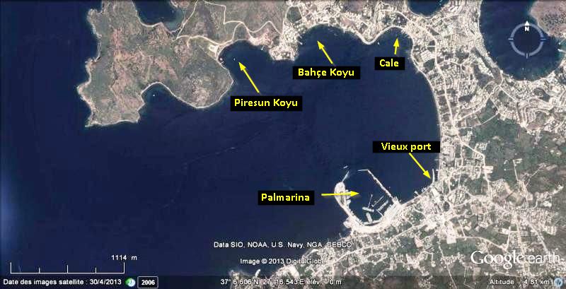 - grande baie au NW de la presqu’île de Bodrum, relativement préservée du tourisme de masse et des ghettos de béton. On y trouvera une grande marina, un vieux port et plusieurs mouillages biens protégé du meltem