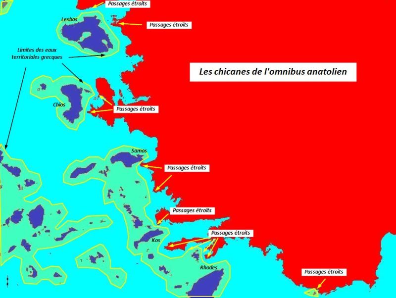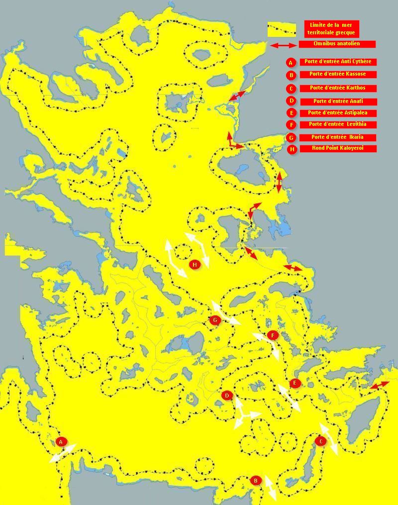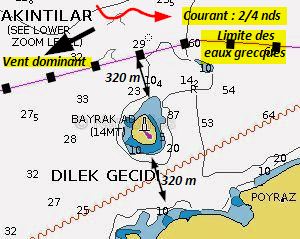 - si vous naviguez le long de la côte turque (c’est l’omnibus anatolien), vous ne pourrez pénétrer dans aucun port, mouillage ou espace de navigation grec, y compris les îles. La limite côtière des eaux territoriales turcs sont de 6 milles, sauf en proximité des îles grecques, où elle s’ajusteront à équidistance d’îles grecques très proches. Ainsi, les limites des eaux turcs seront de :