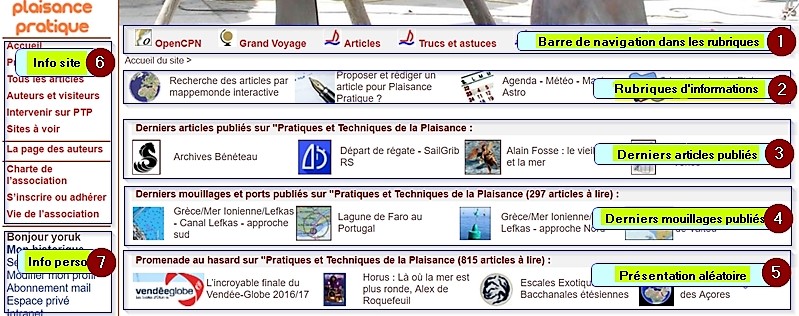 - En haut : zone 6, donne accès aux grands chapitres d’information du site