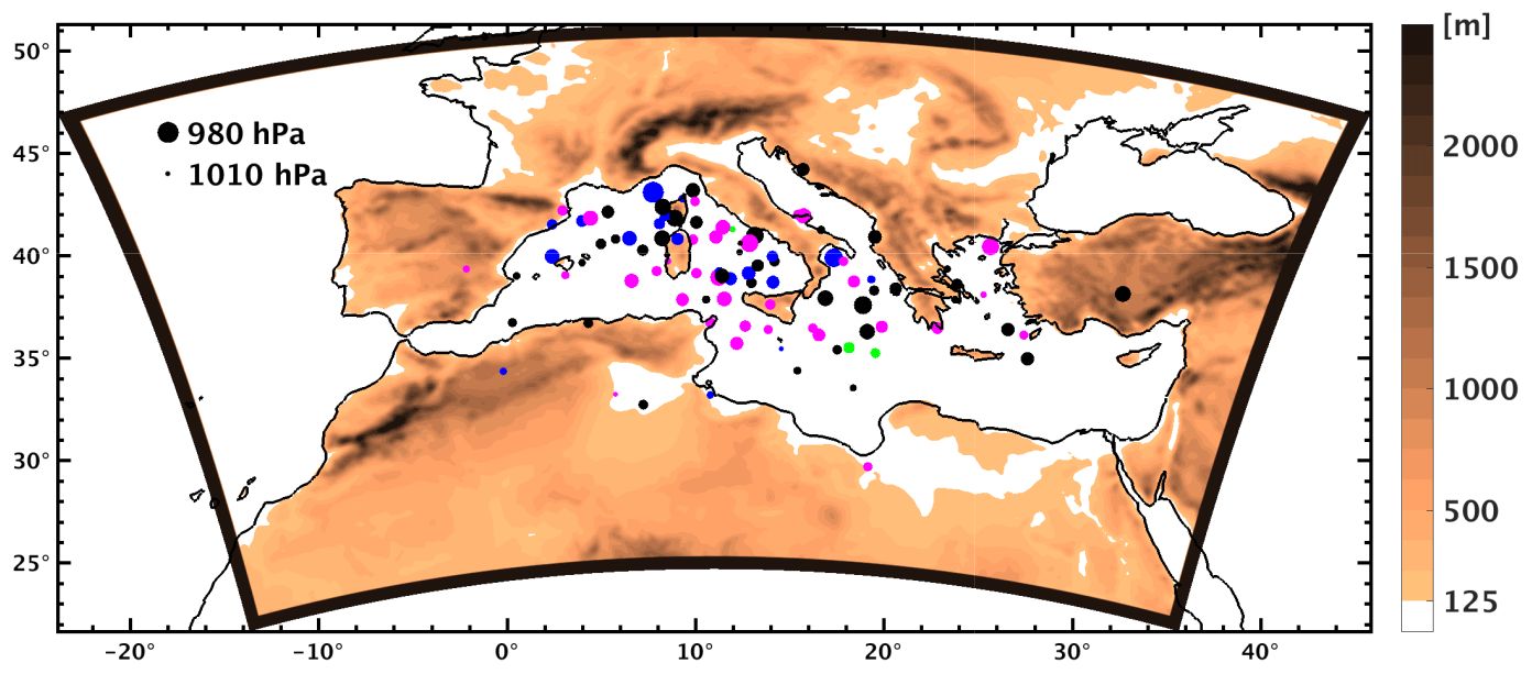 Figure 1 : Domaine des simulations et orographie (couleur). Les points représentent les emplacements des 100 cyclones à leur stade de maturité. La taille des points est proportionnelle à la pression moyenne au niveau de la mer au centre des cyclones (voir légende dans le coin supérieur gauche du domaine). Les couleurs de points représentent la saison : noir pour l’hiver, magenta pour le printemps, vert pour l’été et bleu pour l’automne.
