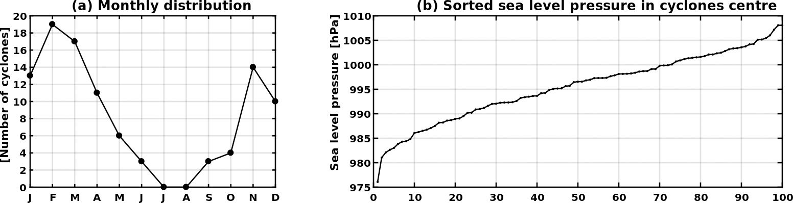 Figure 2 : (a) Distribution mensuelle de l’occurrence des cyclones. (b) Cyclones triés en fonction de leur pression centrale moyenne au niveau de la mer au cours de leur stade de maturité.