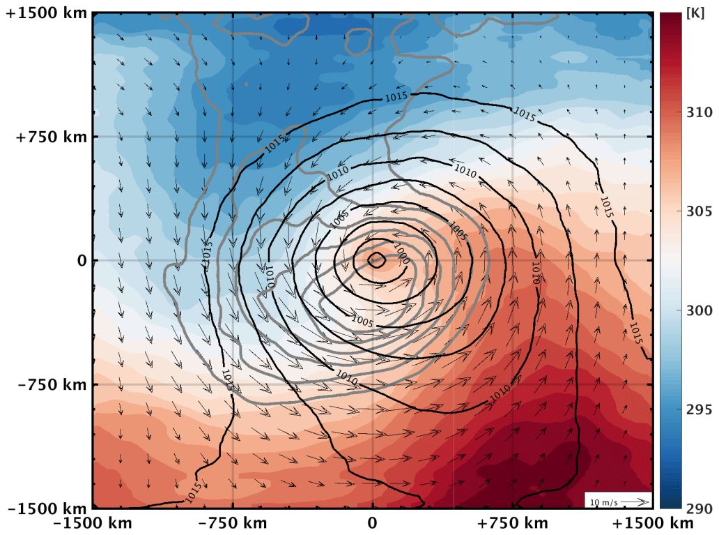 Du point de vue de la pensée PV, un cyclone peut être conceptualisé comme la fusion [amalgamation] de différentes anomalies de PV. Dans ce cadre, nous avons implémenté dans WRF, et appliqué, un diagnostic en ligne à 100 simulations des systèmes les plus intenses qui ont eu lieu sur une période de 10 ans, de 2008 à 2017. Ce diagnostic a décomposé le PV en différents composants, chacun lié à un processus physique paramétré et a permis à l’inversion de PV par morceaux de fournir des informations supplémentaires sur le rôle des différents processus dans le développement des cyclones.