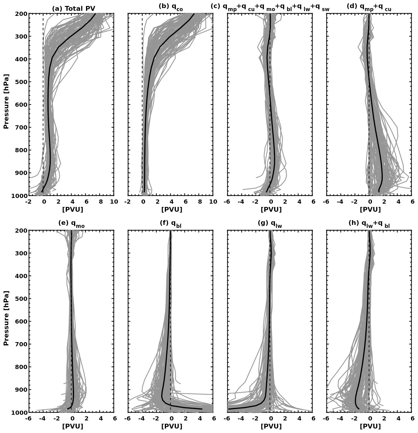 Figure 4 : Profils verticaux du PV total et des traceurs de PV pour les 100 cyclones (en lignes grises), en moyenne 100 km autour des centres des cyclones au moment de leur stade de maturité. Les moyennes de profil et le PVU nul sont représentés respectivement par des lignes noires pleines et pointillées. Notez que la plage de valeurs sur l’axe des x n’est pas commune à tous les panneaux.