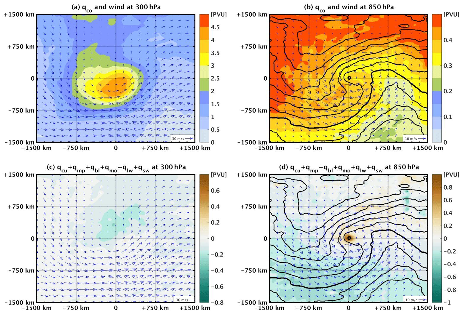 Figure 5 :(a) composites des moyennes pour les 100 cyclones au moment de leur stade de maturité de qco (en couleur) et de vent (en flèches) à 300 hPa. (b) comme en a, mais à 850 hPa. (c) comme en (a), mais pour la somme de tous les traceurs de PV non conservés. (d) comme en (b) mais pour la somme de tous les traceurs de PV non conservés. Notez que les plages de valeurs dans les barres de couleurs diffèrent selon les panneaux. Pour aider à localiser les fronts, la moyenne composite de la température potentielle équivalente (-e) à 850 hPa est également indiquée dans les panneaux (b) et (d) (contours noirs, tous les 2 K, en gras pour 308 K).