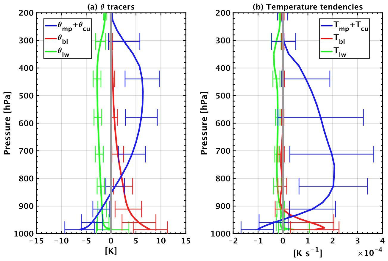 Figure 6 : (a) Profils verticaux moyens des traceurs de θ [θ tracers] pour les 100 simulations, moyennés dans un rayon de 100 km autour des centres cycloniques ; la longueur des barre d’incertitudes est égale au double de l’écart type. (b) comme en (a) mais pour des tendances de température instantanées