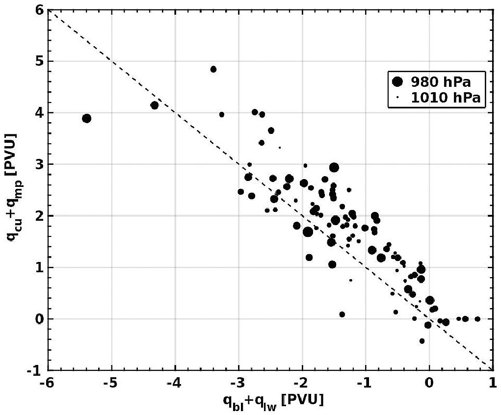 Figure 9 : Nuage de points reliant la somme de qbl et qlw à la somme de qcu et qmp pour les 100 cyclones. Les valeurs des traceurs de PV correspondent à des moyennes dans un rayon de 100 km autour des centres cycloniques au niveau de 850 hPa. La taille du point est proportionnelle à la pression moyenne au niveau de la mer [MSLP] au centre du cyclone et la ligne en pointillés représente l’équation qcu + qmp = - (qbl + qlw)