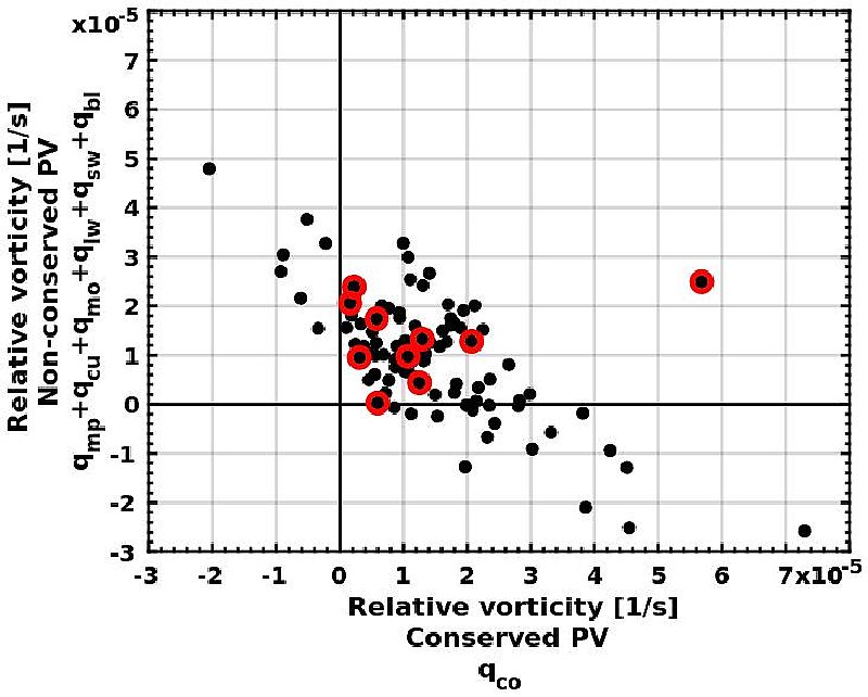 Figure 10 : Nuage de points reliant d’une part les champs de tourbillon relatifs moyennés après avoir inversé les traceurs de PV conservés (axe x) à d’autre part la somme de tous les traceurs de PV non conservés (axe y). Les cercles rouges représentent les dix cas de medicane de notre ensemble de données