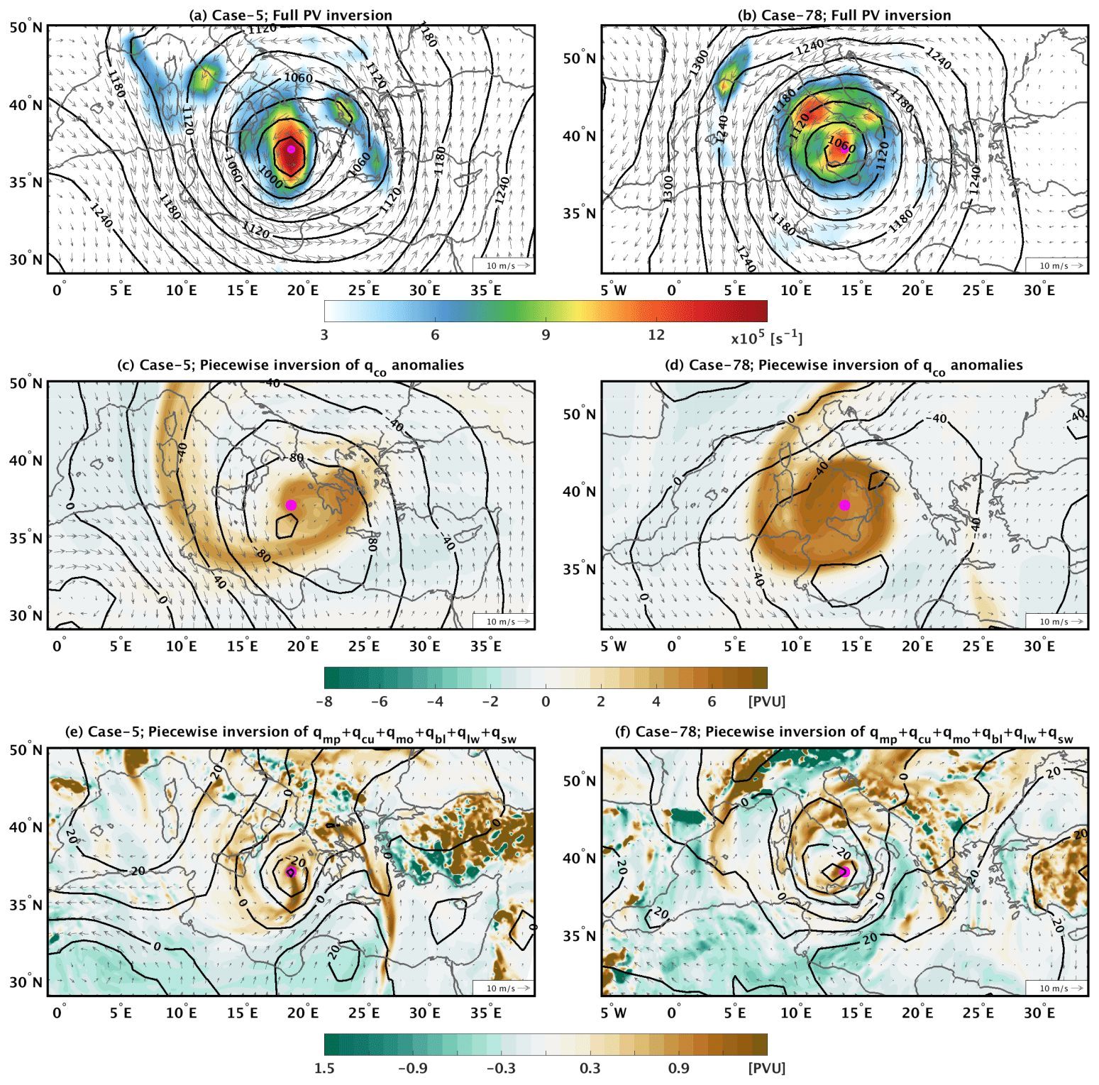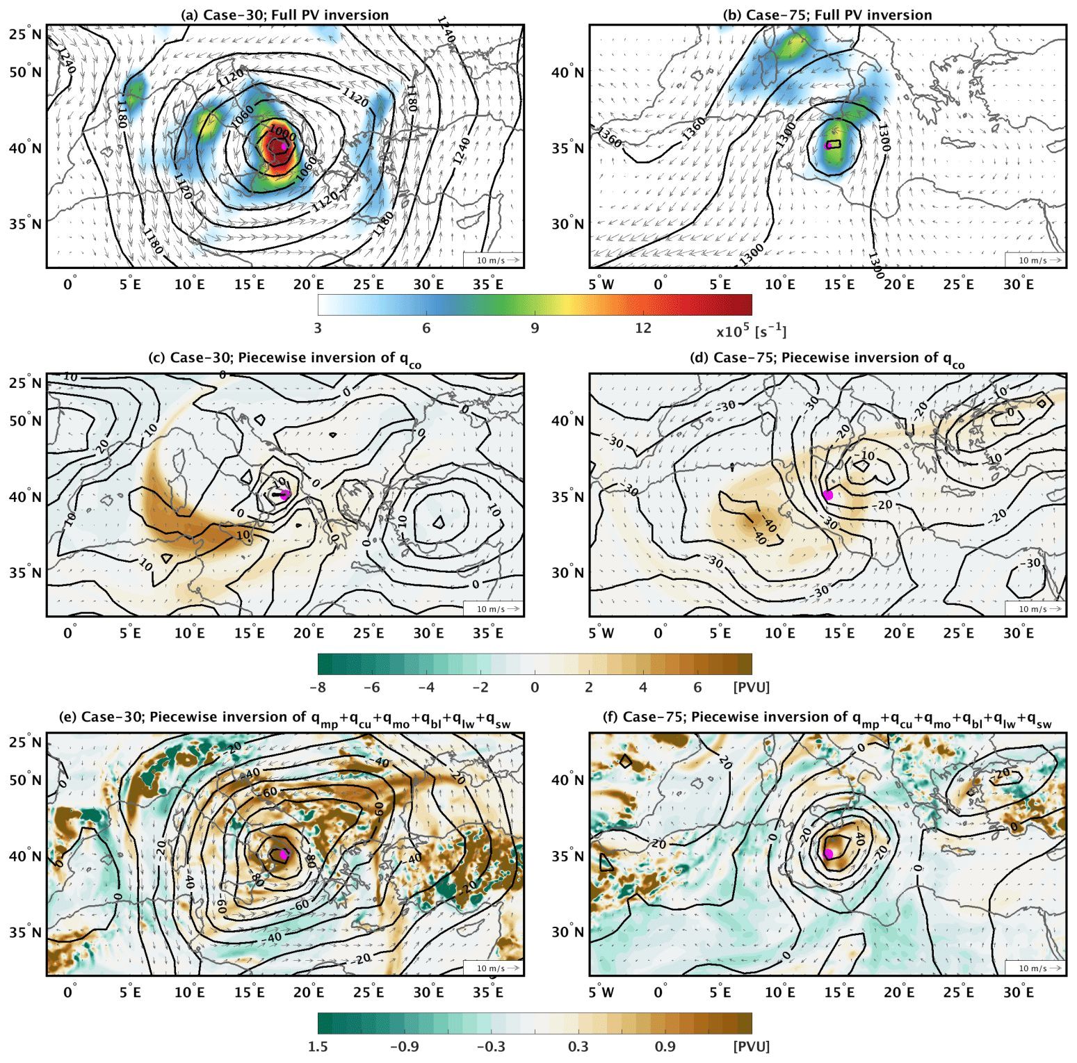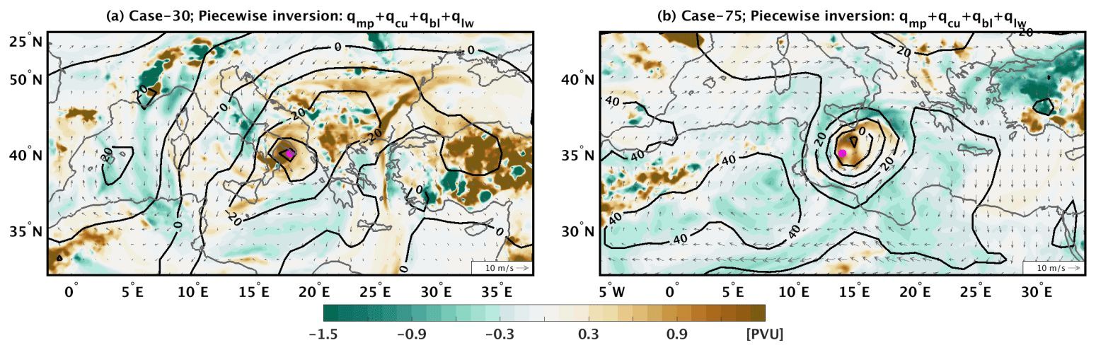La plupart des systèmes ont des valeurs positives de tourbillon relatif moyenné en raison à la fois du forçage barocline et desprocessus diabatiques ; cependant, les valeurs négatives de tourbillon de la figure 10 ne doivent pas automatiquement être interprétées comme des contributions cyclolytiques [l’inverse de cyclogenèse, la destruction] au développement des cyclones. Par exemple, des valeurs négatives de tourbillon relatif moyenné sur la figure 10 peuvent être provoquées par un changement anticyclonique [veering, rotation horaire] brusque des vents faibles [caused by a sharp anticyclonic steering of weak winds], incorporés dans un champ de vent cyclonique plus large. C’est pourquoi l’inversion de PV par morceaux est utilisée dans cette section pour mieux comprendre quels processus jouent un rôle principal dans le développement du cyclone, plutôt que pour quantifier précisément la contribution de différents processus à la circulation du vent cyclonique. Dans les sections suivantes, nous présentons et discutons plusieurs cas remarquables de cyclones méditerranéens.