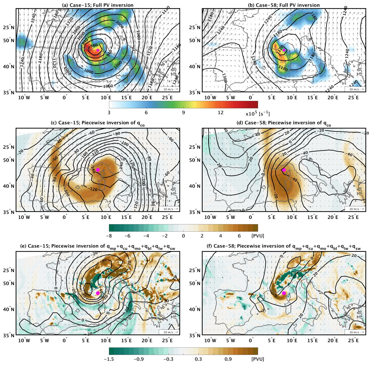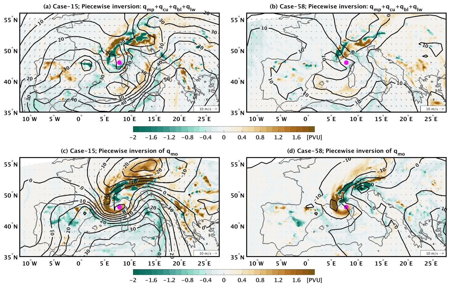 Dans les deux cas, les bannières de PV se démarquent clairement comme des filaments de valeurs de PV élevées qui pénètrent dans le centre du cyclone depuis le flanc ouest des Alpes (figures 14e et 14f). L’inversion par morceaux des traceurs de PV non conservés montre que ces filaments imposent une circulation cyclonique centrée sur les Alpes et renforce les cyclones (figures 14e et 14f).