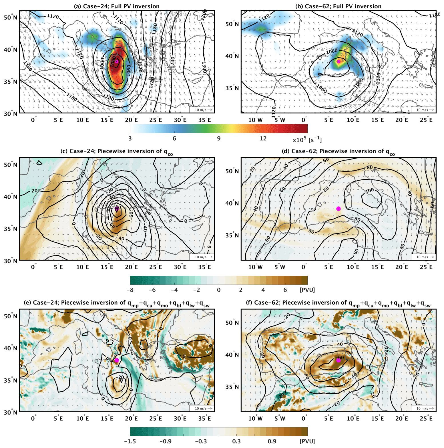 L’application de l’inversion de PV par morceaux aux composants conservés et non-conservés de PV est une méthode suffisante pour déterminer si ces medicanes partagent effectivement des dynamiques similaires avec les cyclones tropicaux, ou du moins sont « principalement » entraînés par des processus diabatiques.