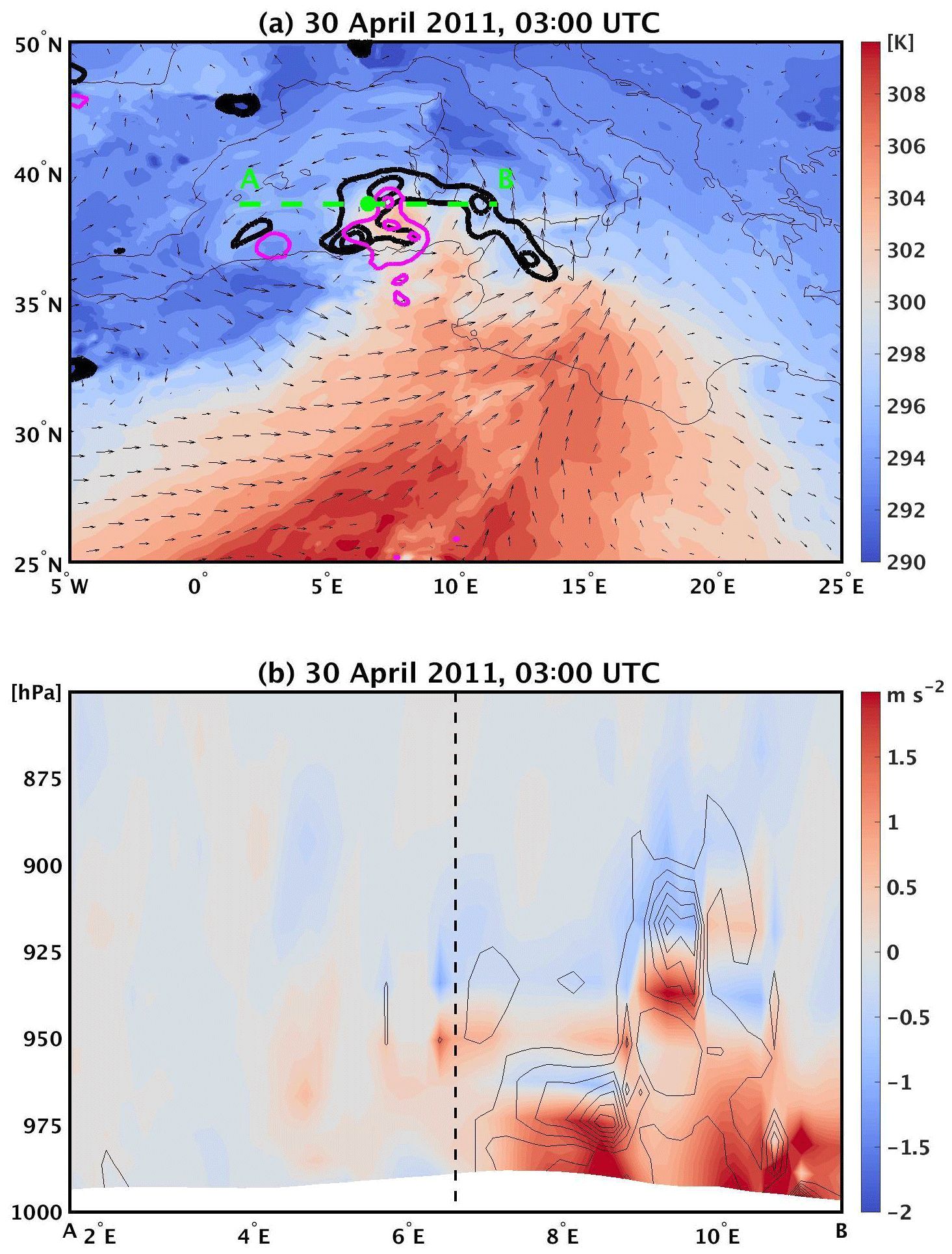 Par conséquent, ce cyclone est clairement renforcé par l’instabilité barocline. Fait intéressant, le champ géopotentiel imposé par le PV non conservé présente également un minimum local, mais ce minimum coïncide avec le centre secondaire du cyclone situé au sud du centre primaire. Par conséquent, un double centre d’un cyclone peut être formé en raison de différents processus et un cyclone pourrait être caractérisé comme un système entraîné [driven] de manière diabatique ou de manière baroclinique en fonction du choix de son centre représentatif. Un cas de cyclone méditerranéen à double centre a été récemment montré par Carrio et al., (2020). Dans leur analyse de l’étude de cas, les auteurs ont montré qu’un centre cyclonique secondaire était niché [nested] dans un cyclone principal [main, primary cyclone]. Ce dernier correspondait à un cyclone baroclinique de basse pression, lié à une structure frontale évidente, tandis que le centre du cyclone secondaire était lié à un minimum local de pression généré par convection.
