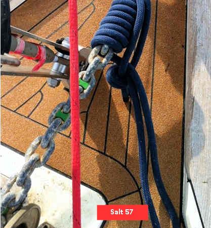 Pour en avoir discuté avec d’autres utilisateurs de bateaux de même taille, il est apparu que si l’on ne pouvait pas trouver la solution sur le pont, il fallait la chercher ailleurs. L’idée de faire plonger les câblots, a fait surface (si, si...). J’en avais parlé à l’époque avec Artimon, sur son fil, et nous sommes équipés de deux câblots de 12 mètres de squareline polyamide 8 torons de 20 mm... La mise en place s’est révélée difficile, en particulier pour le bossage de la chaîne, et son passage dans le davier...
