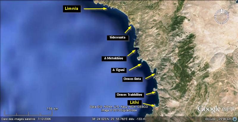 - Entre Lithi et Limnia (Volissos), sur 8 milles, une demi douzaine de mouillages forain de beau temps