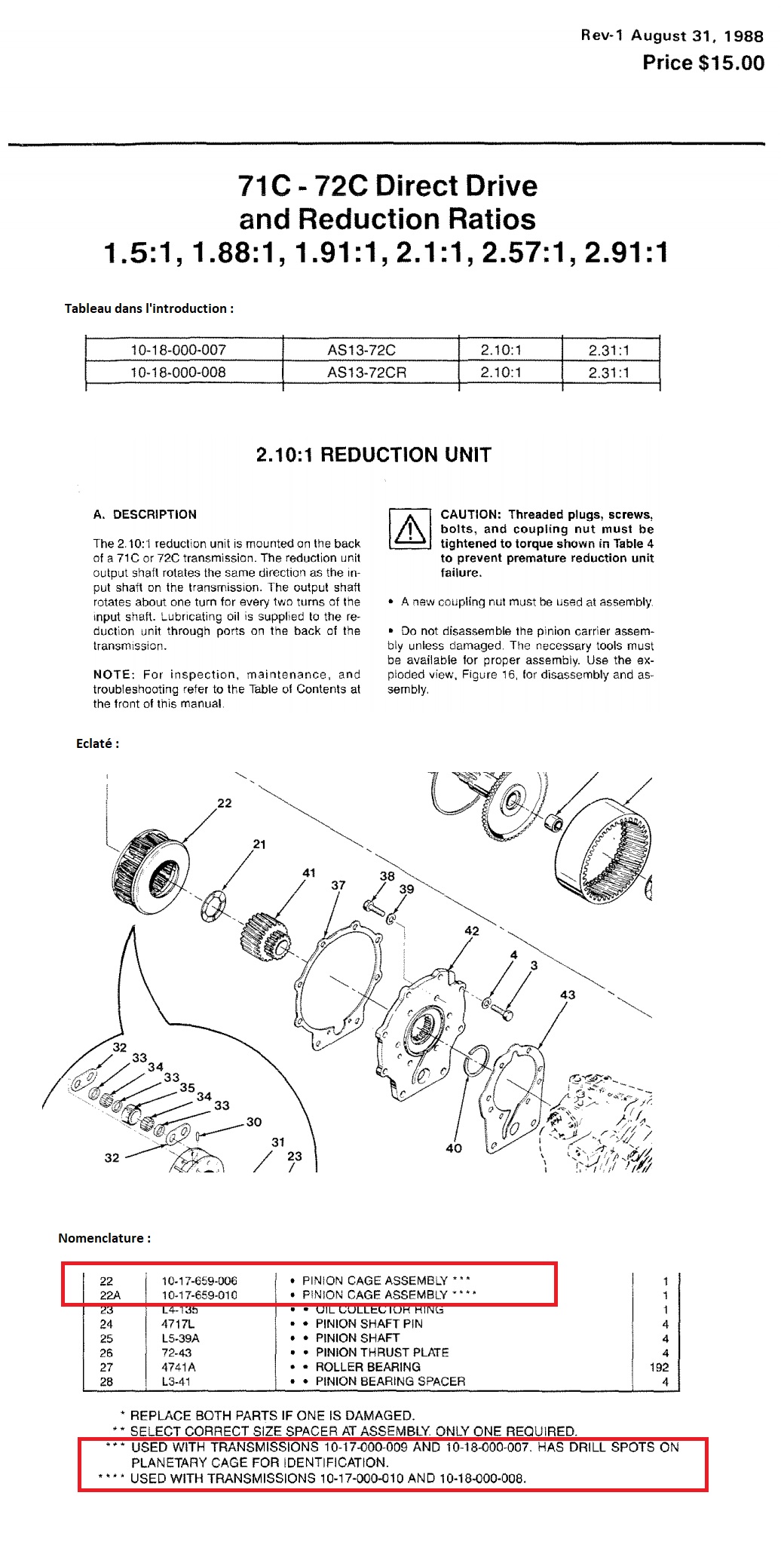 - la partie inverseur des 72 est toujours la même, avec un rapport en marche avant de 1/1 et de 1.1/1 en marche arrière. L’inverseur peut accepter deux sens de rotation du moteur en modifiant le sens de la pompe à huile. Tous les manuels insistent sur le fait que l’inverseur doit être en position avant en marche avant.