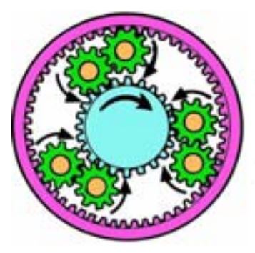 Le pignon d’entrée est le pignon central bleu (parfois appelé pignon solaire ou planétaire intérieur) L’arbre de sortie est entraîné par la couronne externe (magenta), parfois appelée planétaire externe. Sur les BW, le plateau porte-satellites est fixe.