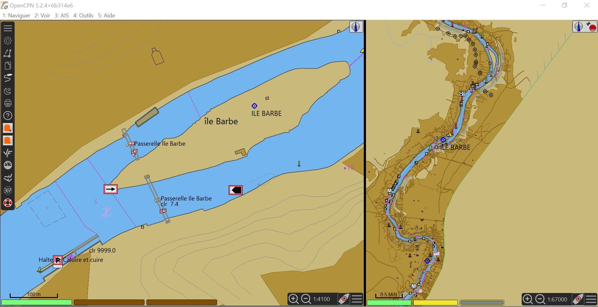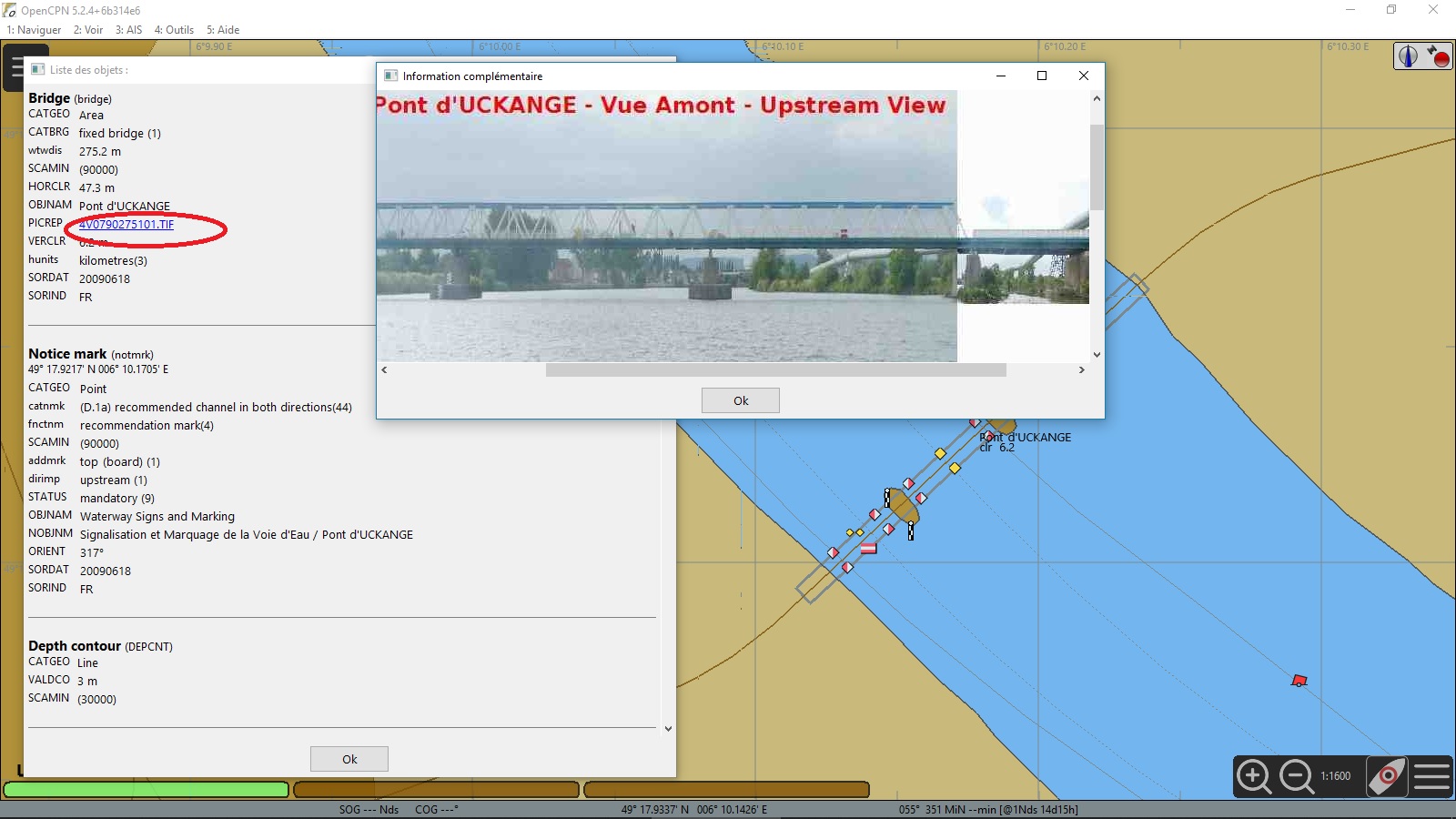 Curieusement, les détails affichés sont différents entre les deux applications. Par exemple, sur OpenCPN les noms des ponts sont affichés en texte, alors que sur SeeMyENC on voit le pont, mais son nom n’est pas indiqué.