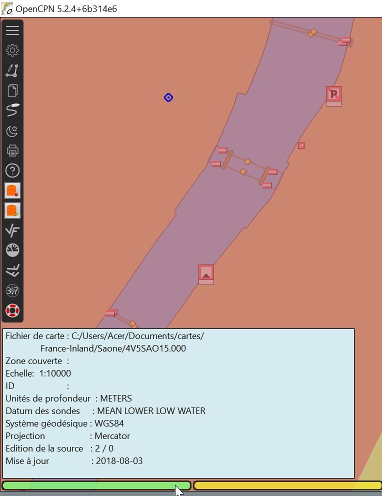 Maintenant ça marche assez bien, sauf un problème sur une des cartes de la Saône. C’est un groupe que j’ai téléchargé depuis le site VNF. Quand je commence par Lyon, et que je vais vers le nord, cela va bien jusqu’à un point où un rectangle arrive sur l’écran qui fait planter l’application. Il doit y avoir dans ce fichier une donnée mal gérée par OpenCPN, alors que cette même carte est correctement affichée par SeeMyENC. La carte est le fichier 4V5SAO06.000, mais les blocs voisins font le même effet. JE ne peux voir que la partie sud de la Saône sans planter.-