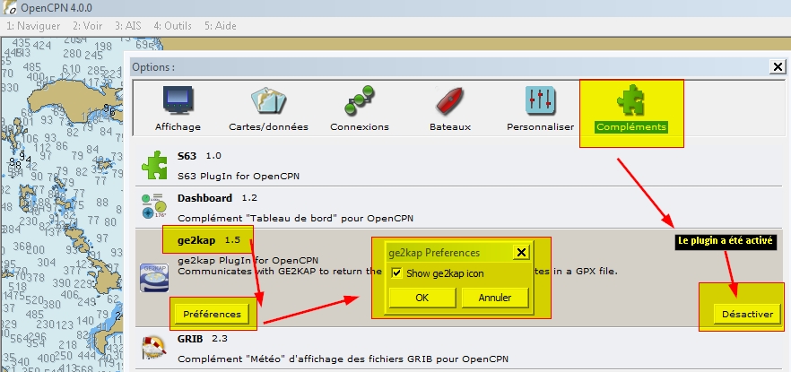 Pour W7, Si le plugin GE2KAP a bien été copié sous le répertoire :- C :\Program Files (x86)\OpenCPN 4.0.0\plugins\ge2kap_pi.dll