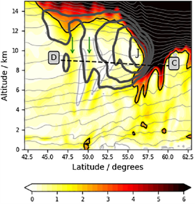 Figure 2 : Une coupe transversale nord-sud à travers le courant-jet (contours en gras) montrant également le tourbillon potentiel (ombrage ; unités : PVU), la température potentielle (contours fins) et la tropopause (ligne noire). Cet exemple provient d’un modèle de prévision NWP. La ligne en pointillés montre la trajectoire d’un vol de recherche visant à mesurer la structure de la tropopause au cœur du jet. (adapté depuis Harvey et al., 2020)