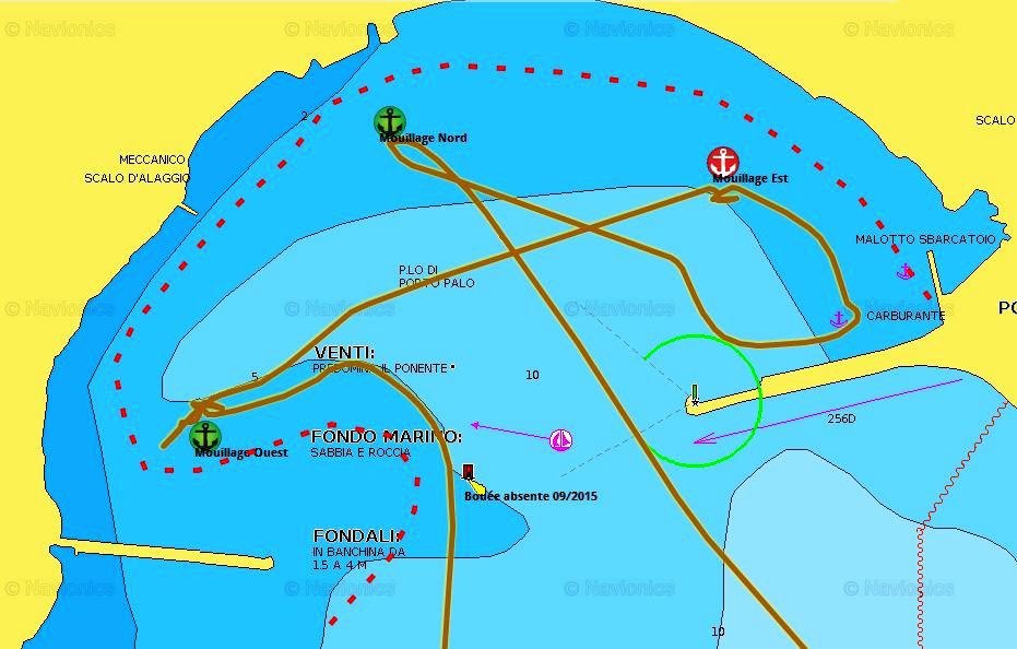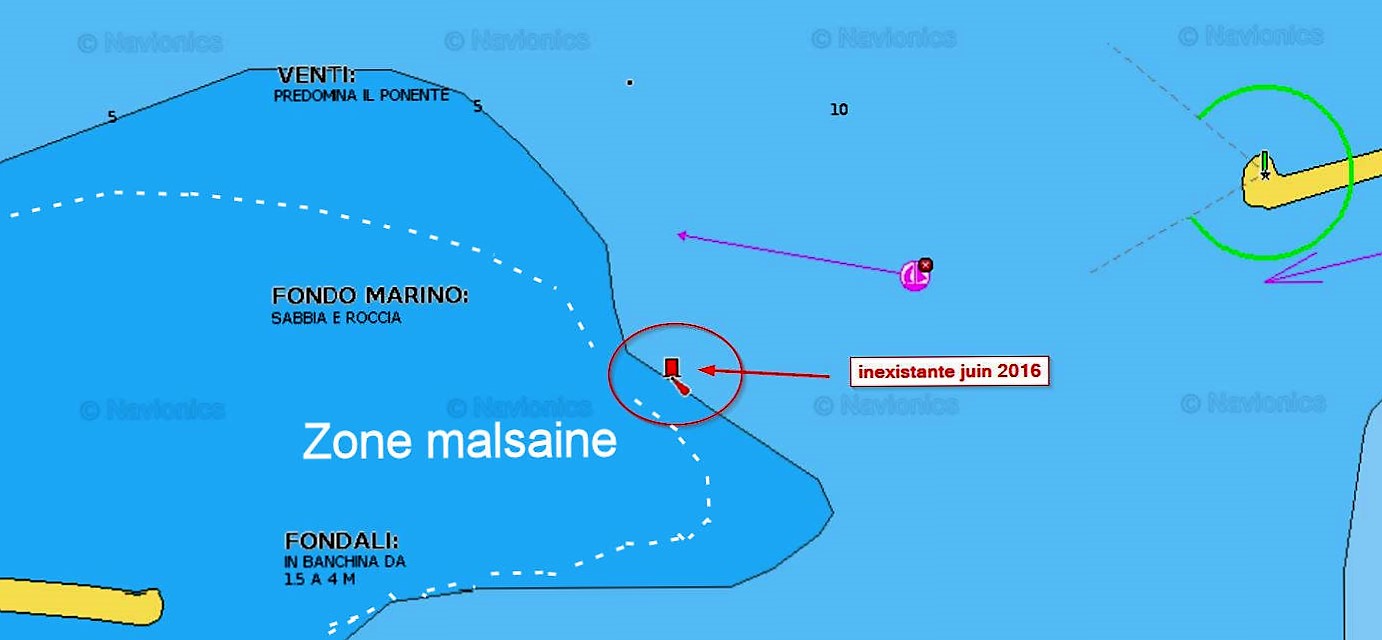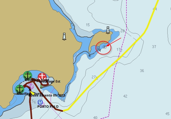 - Les haut fonds frangent, cette partie de la baie. Ils débordent très largement le môle ouest, jusqu’à la hauteur de la bouée rouge (inexistante en sept 2015) c’est à dire à environ mi distance entre les môles Est et ouest.