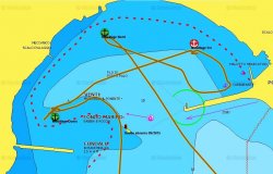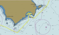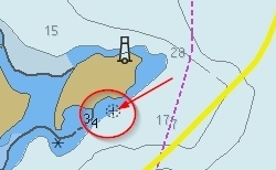 Attention : au NW, un chantier qui tire de gros chalutiers au sec, à installé des bouées qui lui serviront au halage.