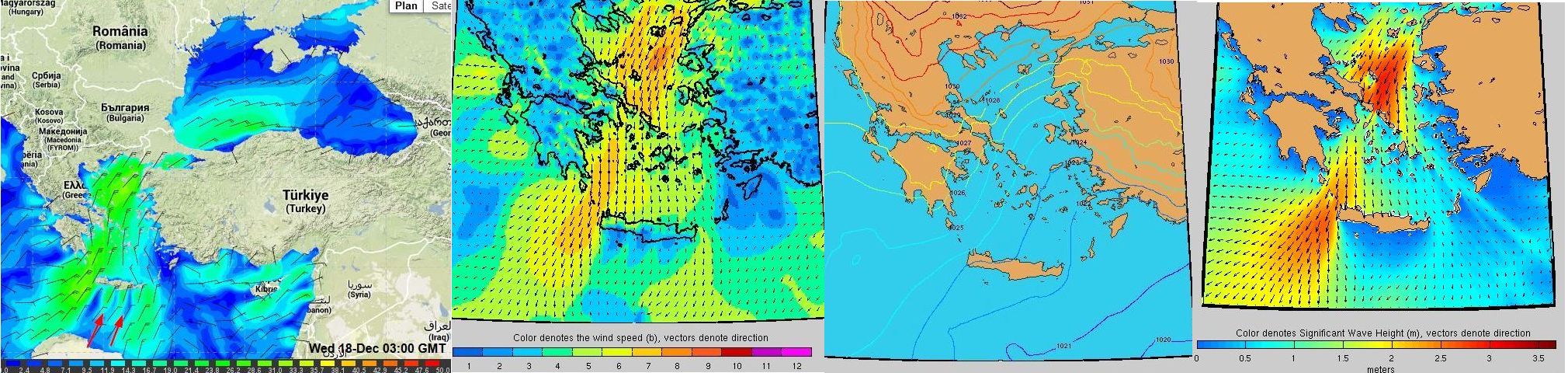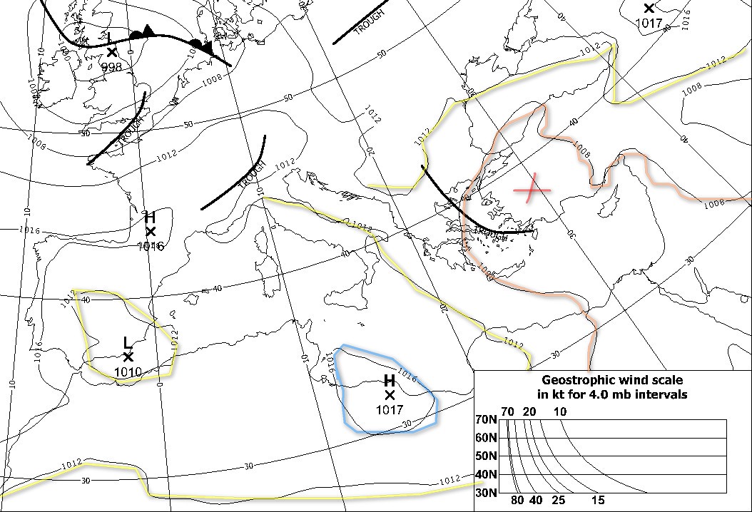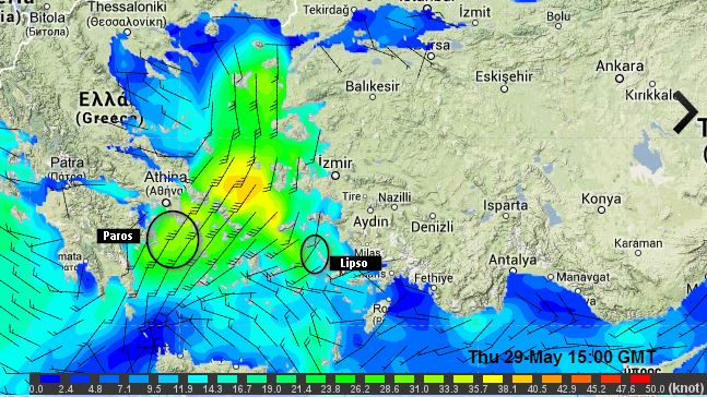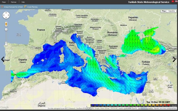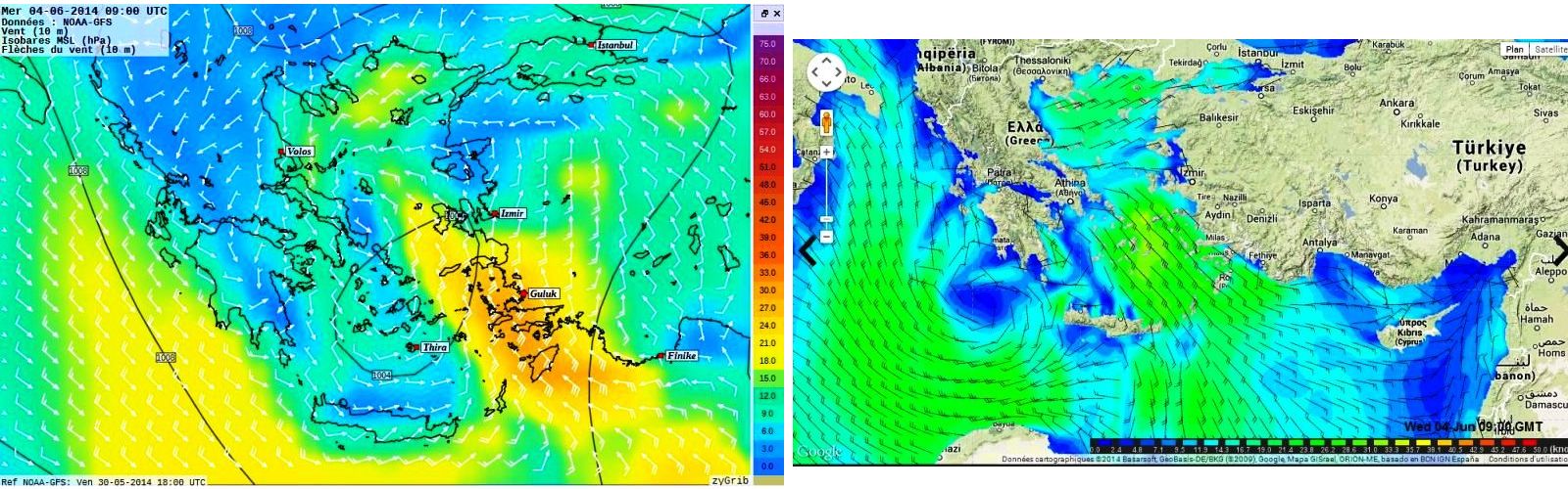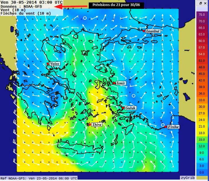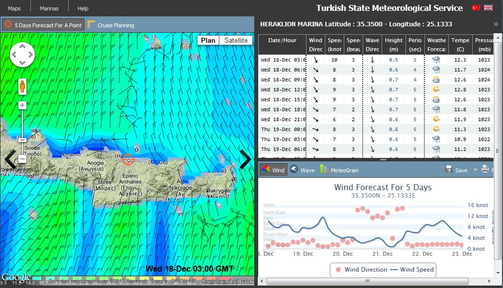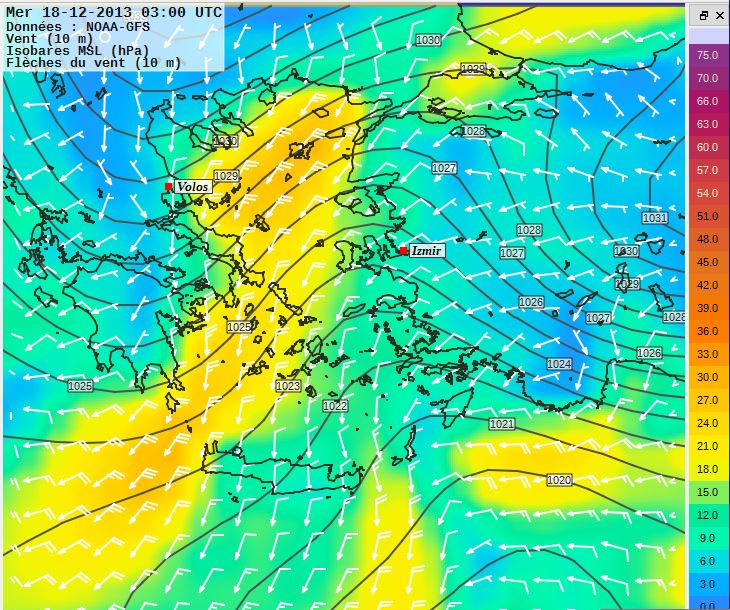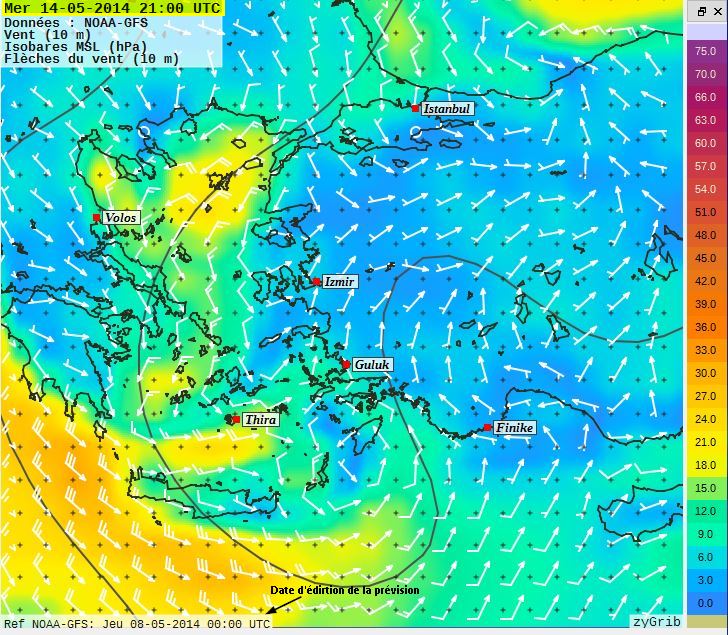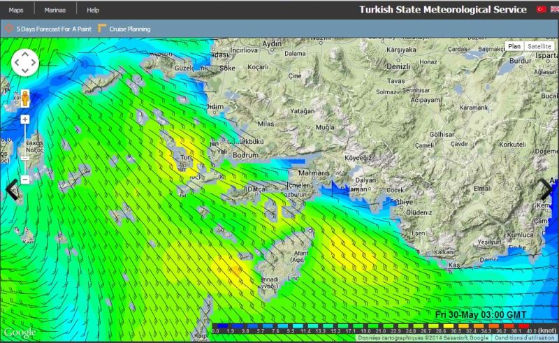 Dans le dernier numéro de la revue de la Cruising Association britannique, Franck Singleton, qui est bien connu de tous ceux qui s’intéressent à la météo marine en Méditerranée, signale que sur le site de la météo marine turque, on trouve une page avec des cartes présentées de la même façon que les fichiers grib, donnant le vent et les vagues (au pas de trois heures), sur 5 jours sur l’ensemble de la Méditerranée. On peut zoomer sur la carte pour obtenir des zones plus détaillées, par exemple le canal d’Otrante et la mer Ionienne nord ou l’Egée nord..