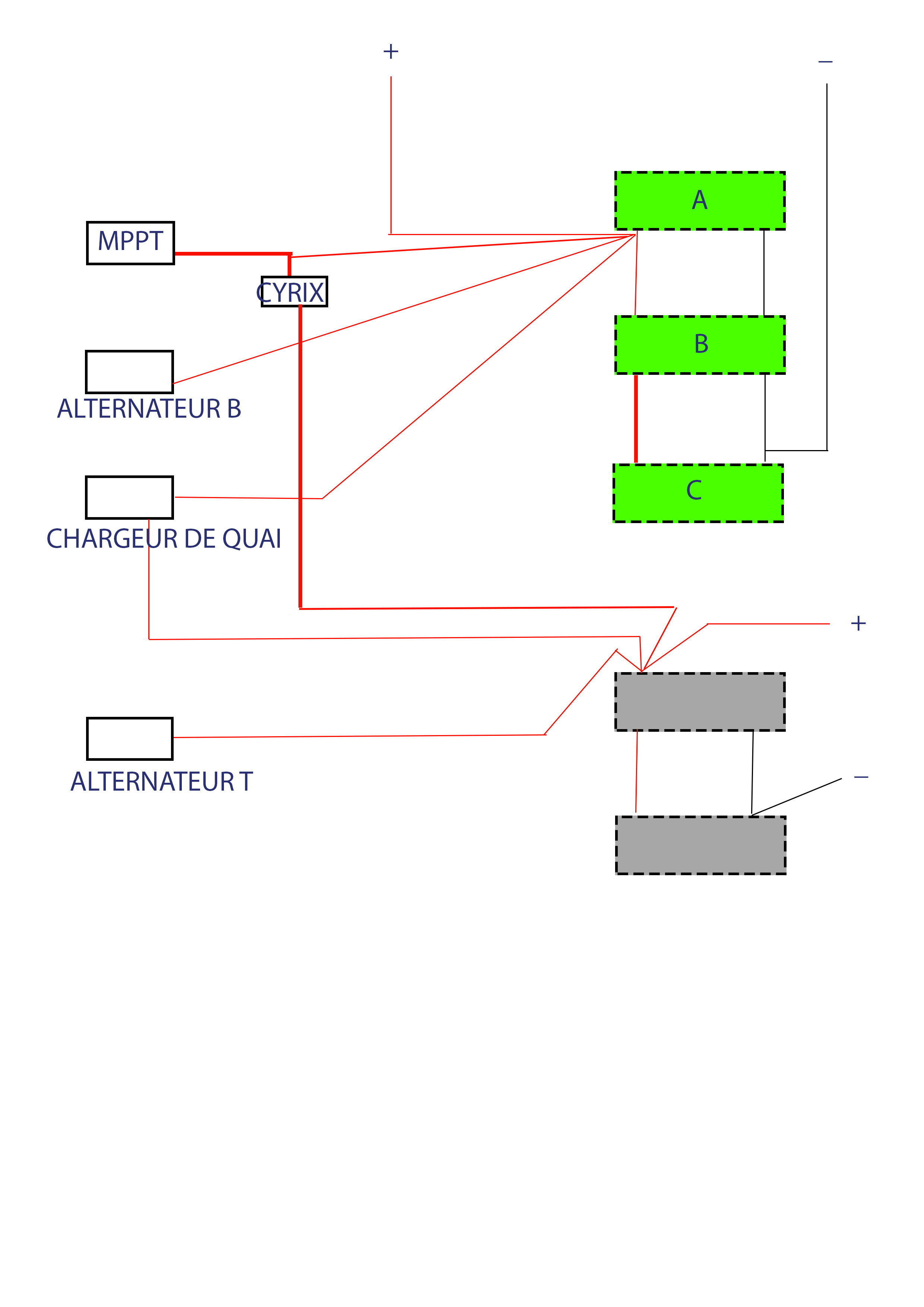 il faut brancher toutes les arrivées des chargeurs sur la même batterie, dans le cas contraire le chargeur de quai rentre en conflit avec le Victron et l’on a :