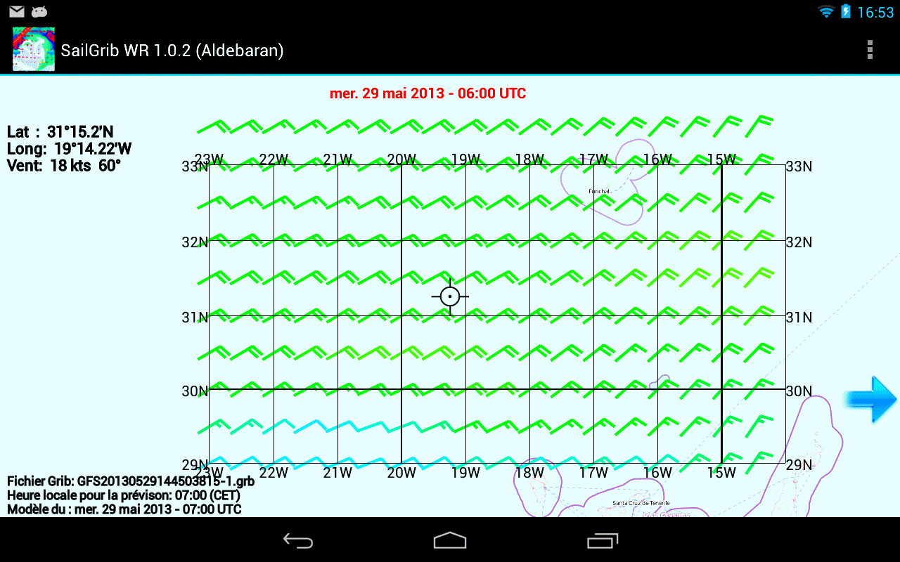 • WW3 : Il s’agit du modèle de vagues WaveWatch III de la NOAA. Le modèle est global mais ne couvre que les mers ouvertes ; la mer Méditerranée n’est pas couverte. Les données sont disponibles sur une grille de 1 ° x 1,25° (latitude x longitude), toutes les 3 heures, de 0 à 180 heures. Les données sont calculées pour 00h00, 06h00, 12h00,18h00 GMT et sont disponibles en HH +06:00. Les paramètres disponibles sont le vent, la hauteur significative des vagues ainsi que direction moyenne et la période moyenne des vagues.
