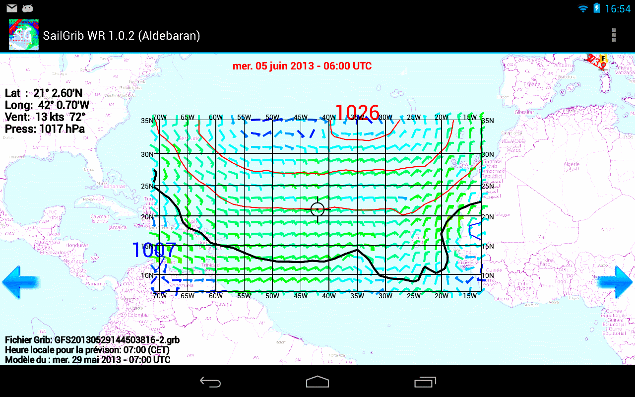 • COAMPS : Il s’agit d’un modèle régional calculé par l’US Navy. Les données sont disponibles pour seulement quatre régions : l’Europe et la mer Méditerranée le Pacifique est, l’Atlantique ouest ainsi que la mer des Caraïbes et l’Amérique centrale. Les données sont disponibles sur une grille de 0,2 ° x 0,2 ° par intervalles de 6 heures, de 0 à 72 heures pour l’Europe et la mer Méditerranée ainsi que l’Atlantique ouest et 48 heures pour les 2 autres régions. Les paramètres disponibles sont le vent et la pression.