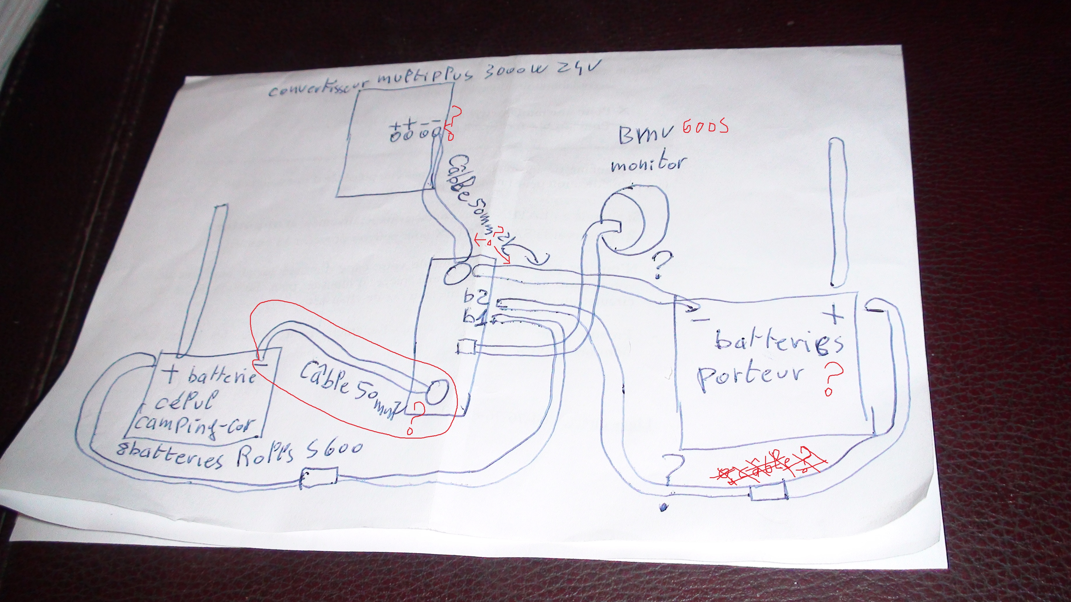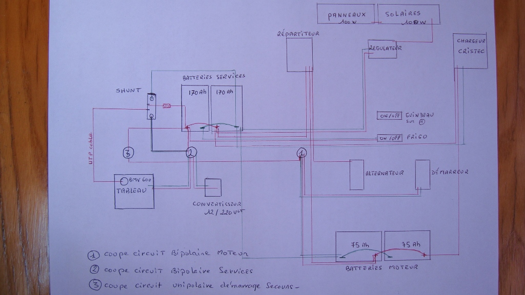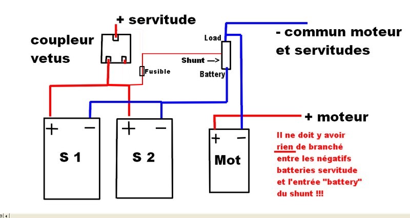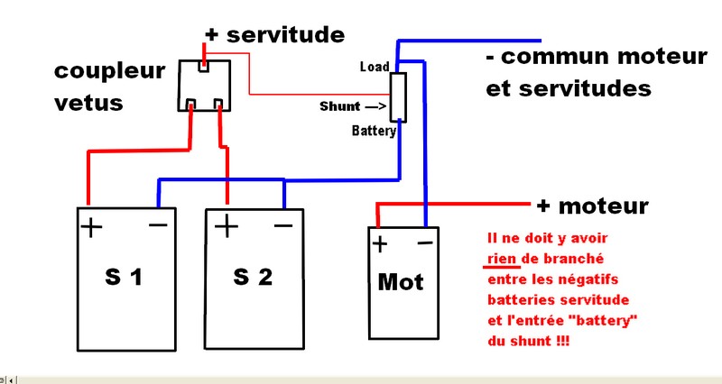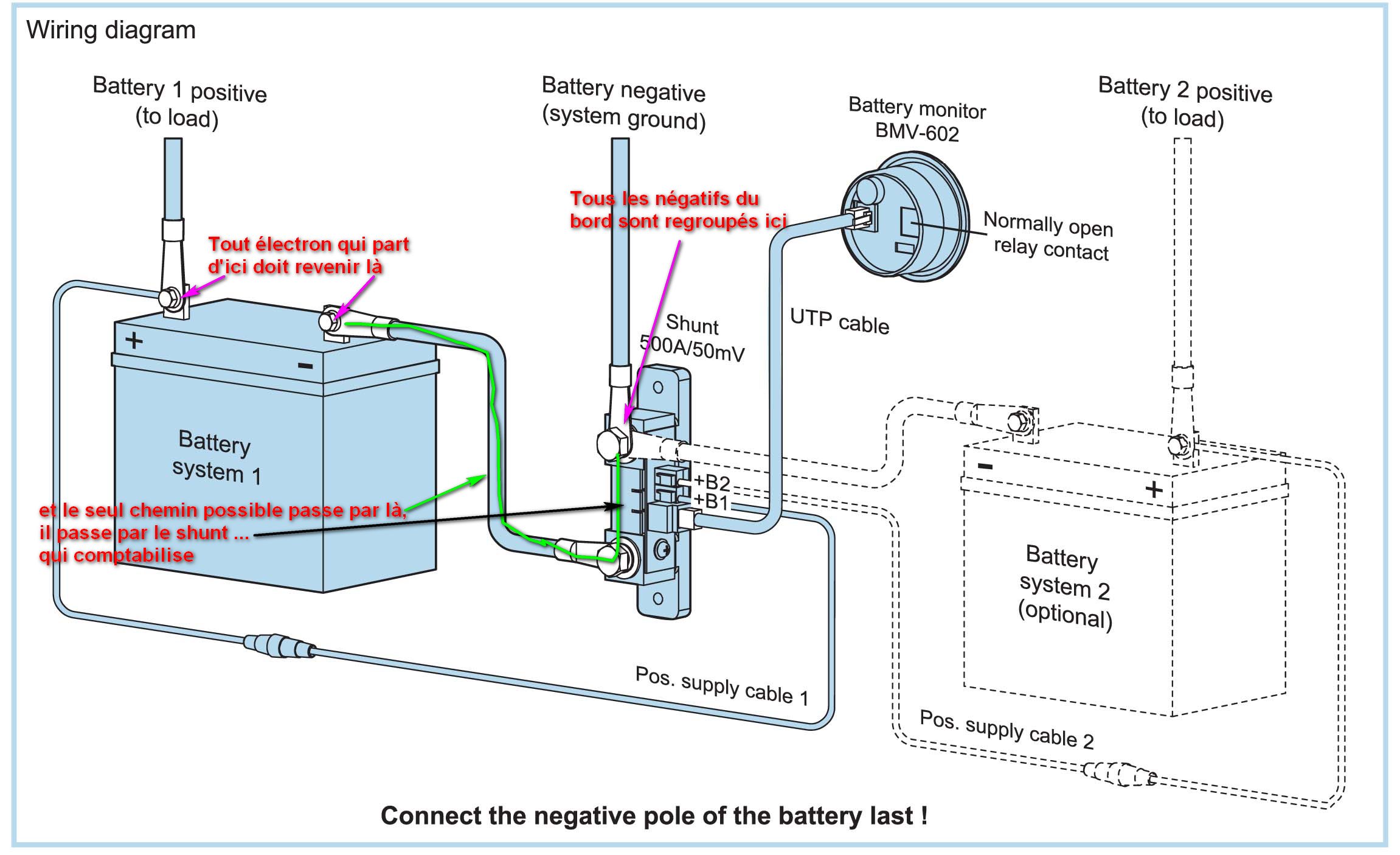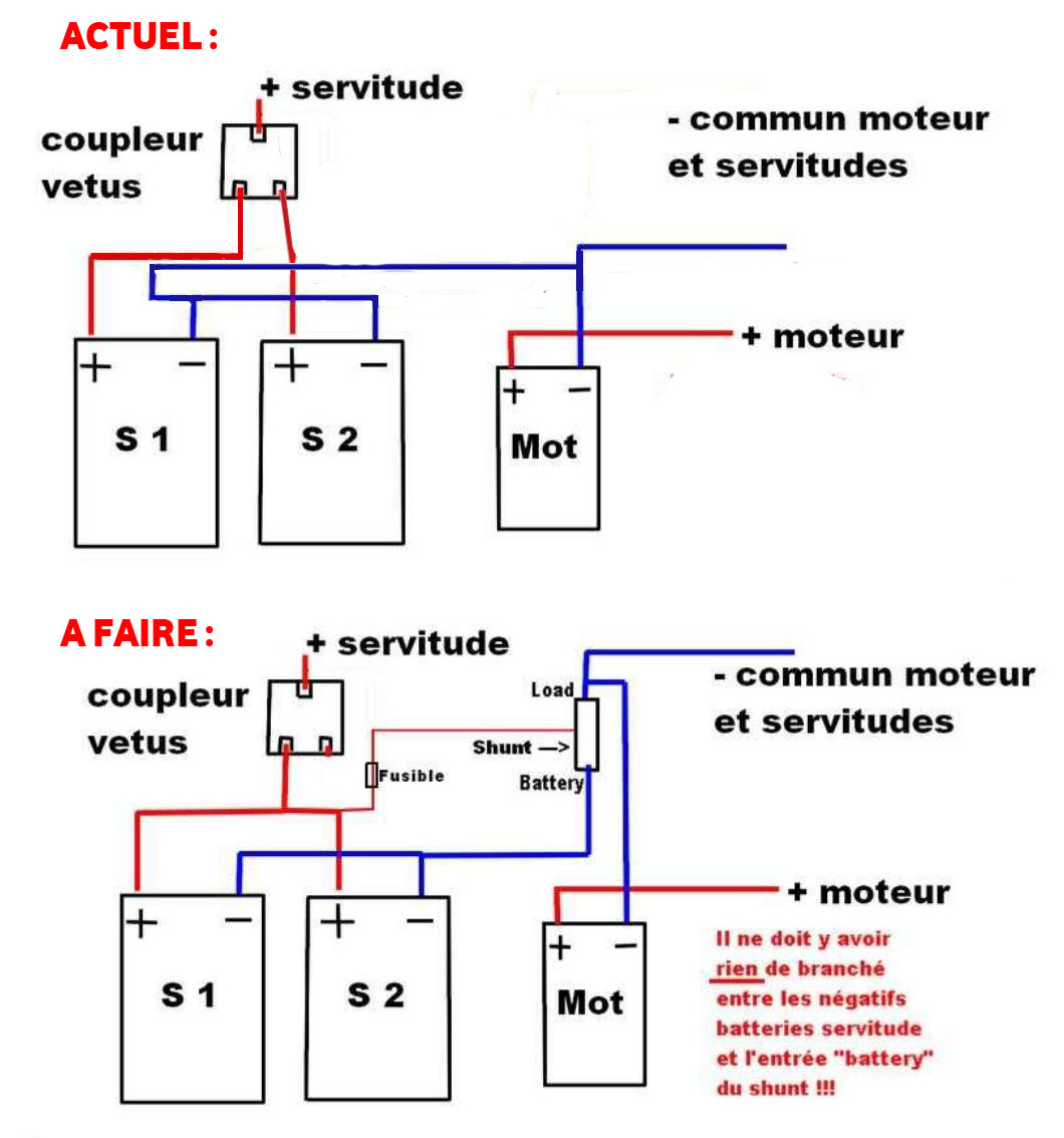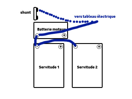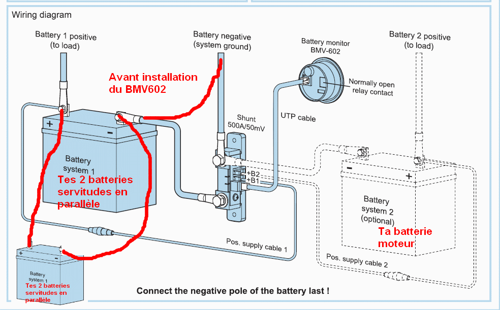 J’ai donc acheté un controleur de batterie VICTRON BMV 600s ? Après la commande, je me suis affolé en lisant que ce controleur était fait pour UNE batterie seullement. J’ai donc appelé le vendeur ( NAVIMO), leur ai dit que je voulais echanger pour un 602. Iils m’ont rassuré de suite en me précisant : « une batterie ou un PARC de batterie ! en parallèle ou en série, ça n’a aucune importance ! » ça tombe bien j’ai un parc de 2 batteries de servitude ( 2 x 200ah ), alimenté par alternateur, panneaux solaires et éolienne ( via le régulateur qui va bien)