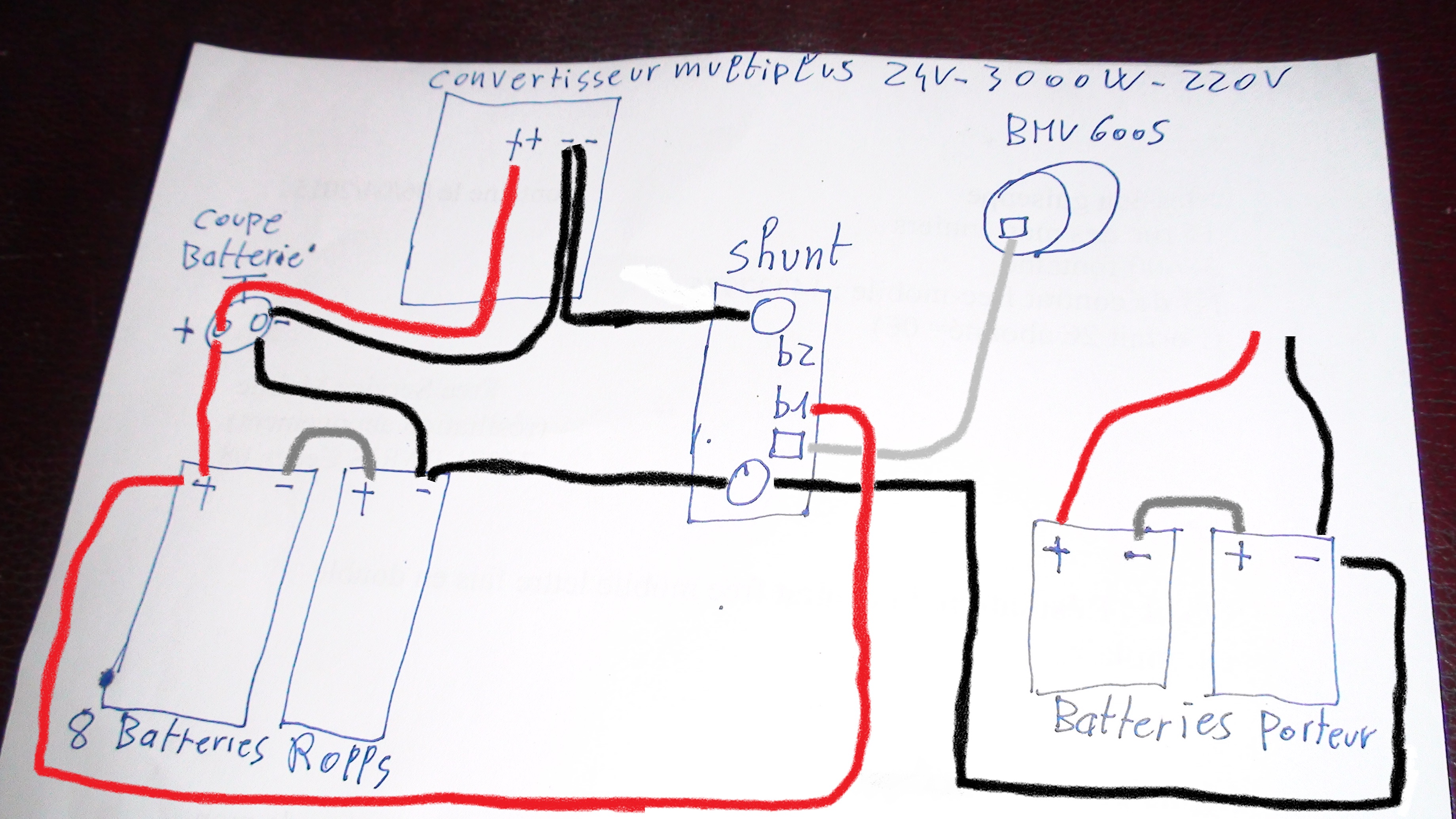 malgré que j’ai lu les différents post pour le branchement du BMV 600S je me pose différente question ! (1) je vous joins un petit schéma me dire se que vous en pensé ? (2) les branchements sont bon ok ? (3) dimension des câbles 50mm2 ? merci d’avance pour vos réponse et confirmation.