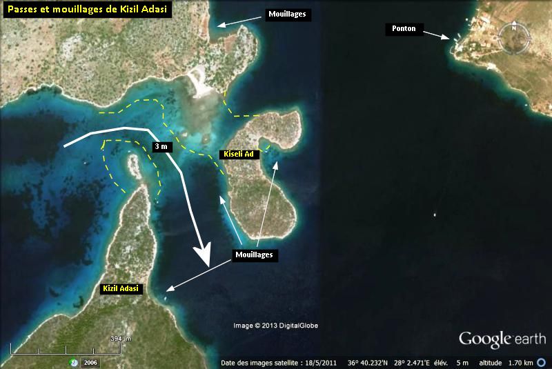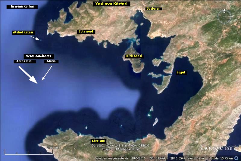 - Toute la côte Nord, depuis Atabol Kayasi, jusqu’au passes de Kisil Adasi, indentée de belle criques, sujettes au Meltem, mouillages de beau temps exclusivement
