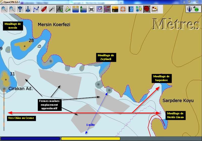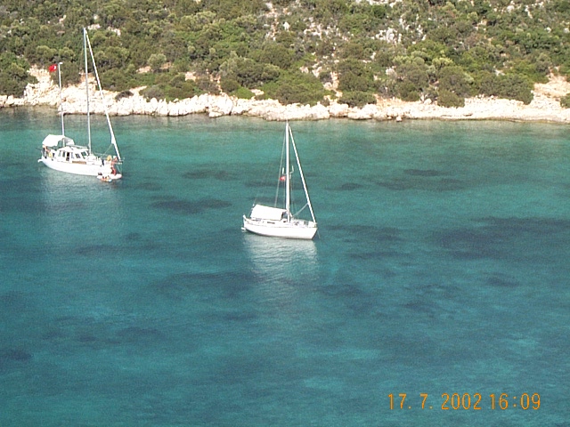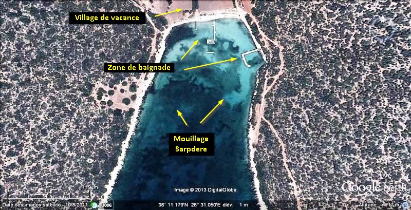 - Le mouillage Nord de Sarpdere, près d’un petit village de vacance turc. Les fonds sont semblables à ceux de Nerkis. La petite jetée au Nord avec peu d’eau, est réservée aux baigneurs. A l’Est de cette jetée, ce qui semble être un port de barque est en fait une zone de baignade coranique, réservée au femmes. Par décence, on évite de mouiller à côté, nous ne sommes pas chez nous...
