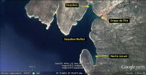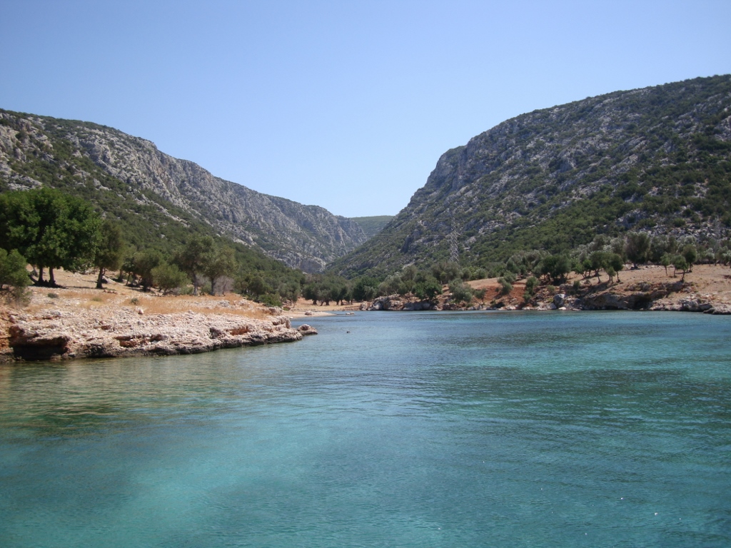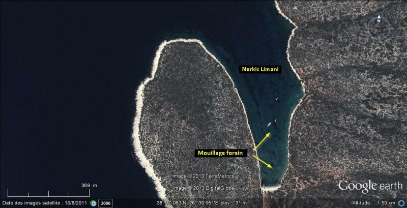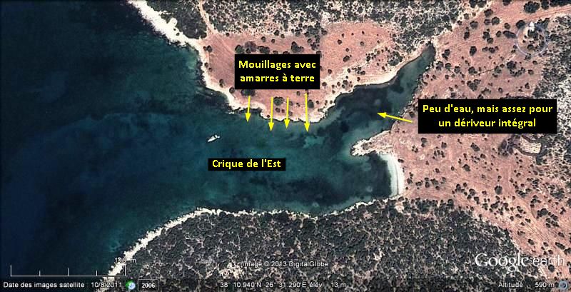 - La crique de l’Est, totalement sauvage, dans un cadre de verdure étonnant, celui d’une petite plaine cultivée. On passe des amarres à terre, les fonds semblent de moins bonne tenue qu’à Nerkis. Les rafales, au débouché de la vallée peuvent être très violentes. Amusant : un dériveur intégral peut se glisser tout au fond au NE de la crique, avec 4 amarres à terre ...