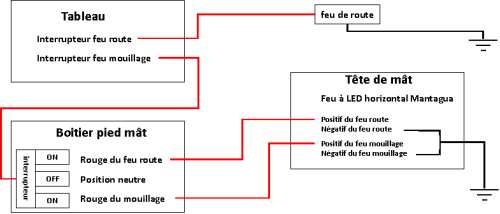 Puis il suffit de connecter l’ancienne alimentation positive du feu de mouillage à incandescence, et l’interrupteur de feu de mouillage du tableau, pour alimenter l’interrupteur trois positions.