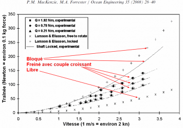 - Les études récentes pour les hélices fixe (= non repliables) et bien documentées montrent que pour des hélices « plaisance » habituelles la traînée est plus faible lorsque l’hélice est laissée en rotation libre
